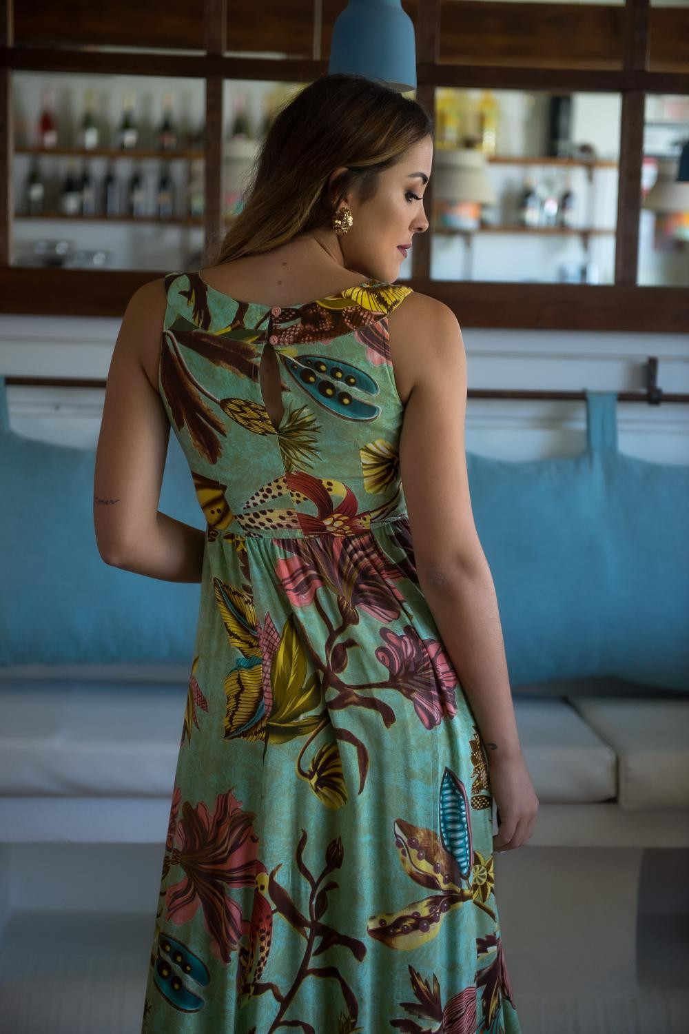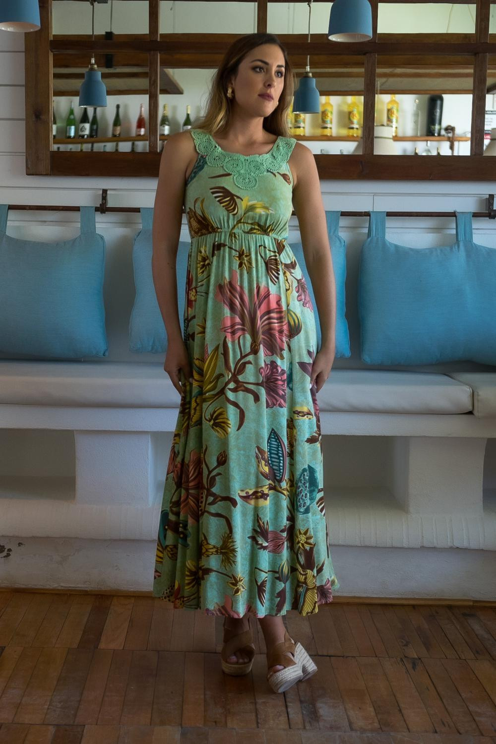 Vestido largo estampado en Trenza en tonos pastel , espalda descubierta con tiras fruncidas , cuello halterCOMPOSICIÓN: 70% POLIESTER 30% SEDA