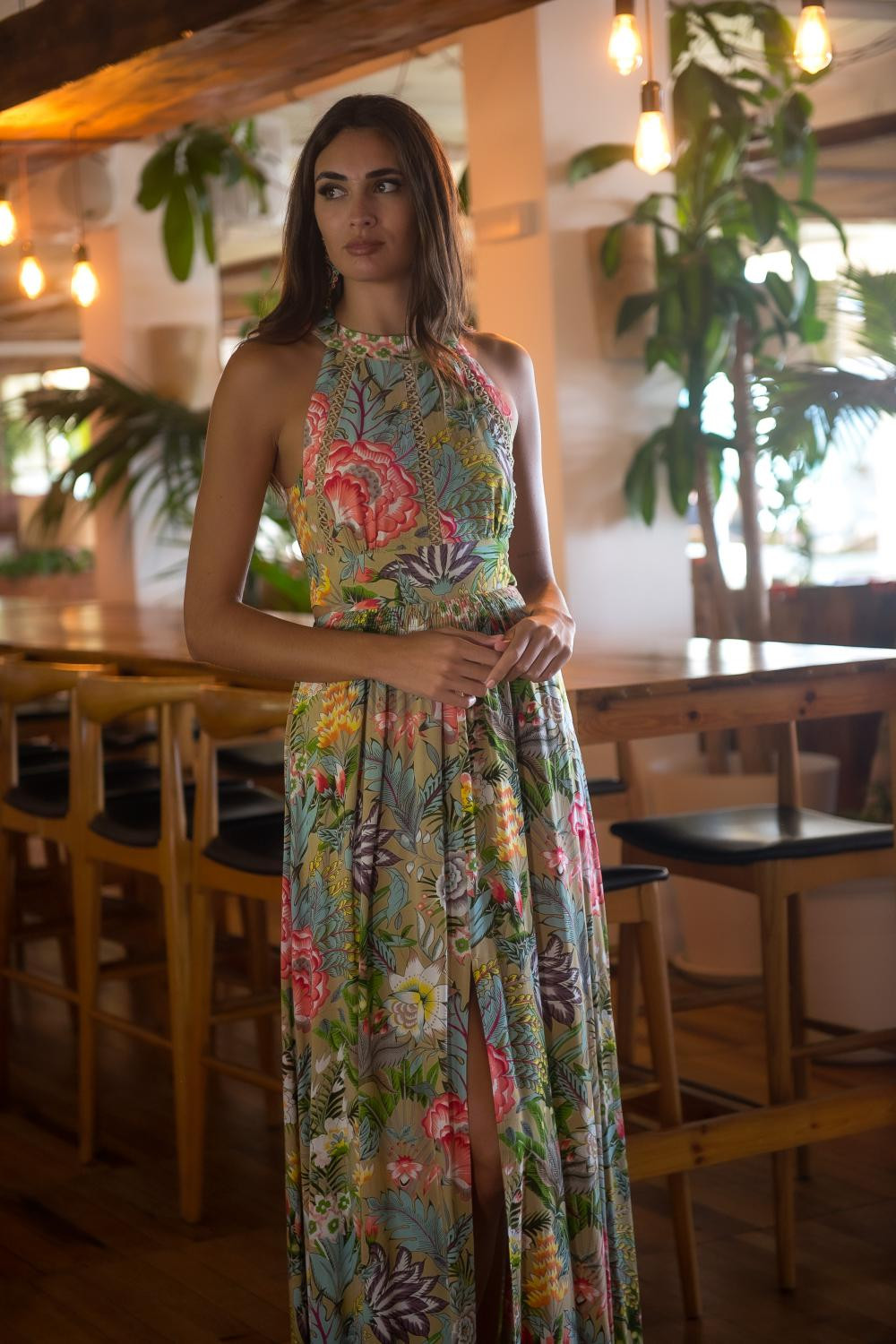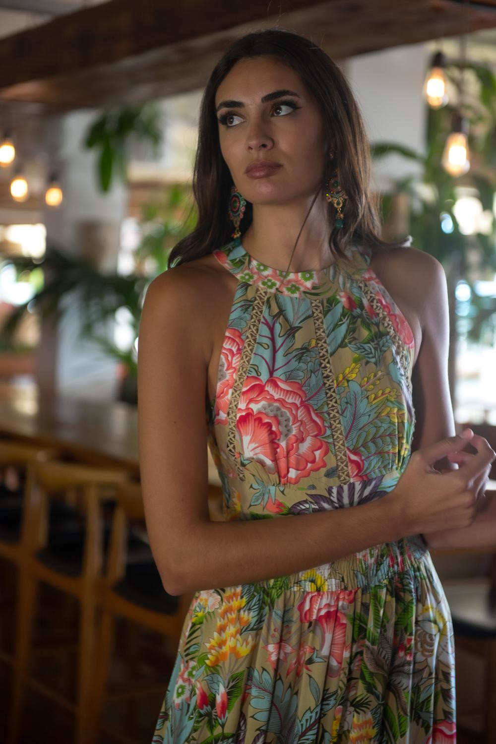 Vestido azteca cruzado de polysilk estampado de fondo negro con figuras geométricas en verde agua y coral largo sin manga cruzado con volante de capa en el bajo.CALIDAD: 70% POLIESTER 30% SEDA