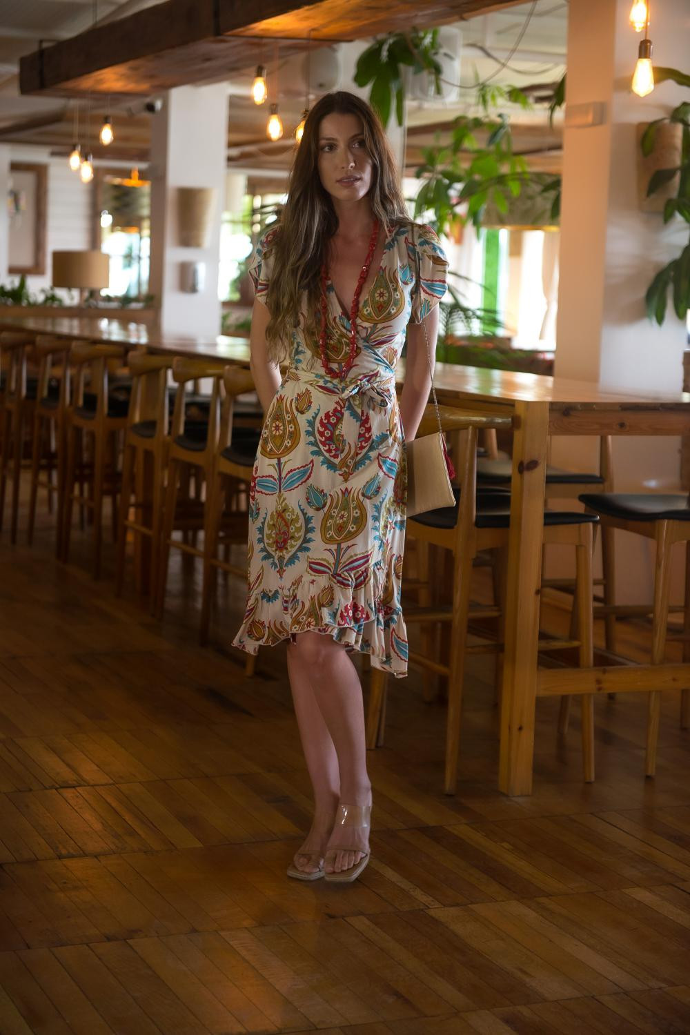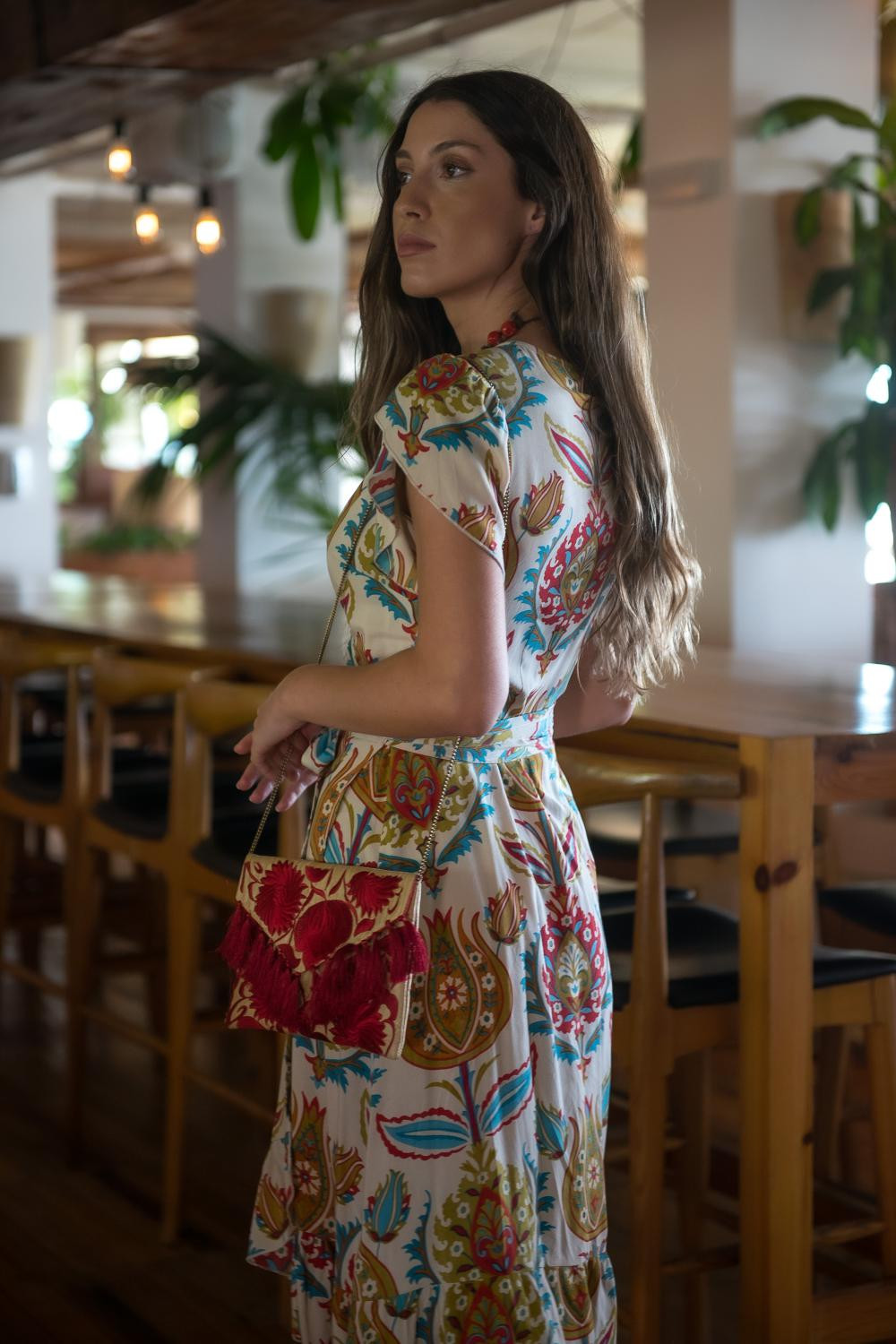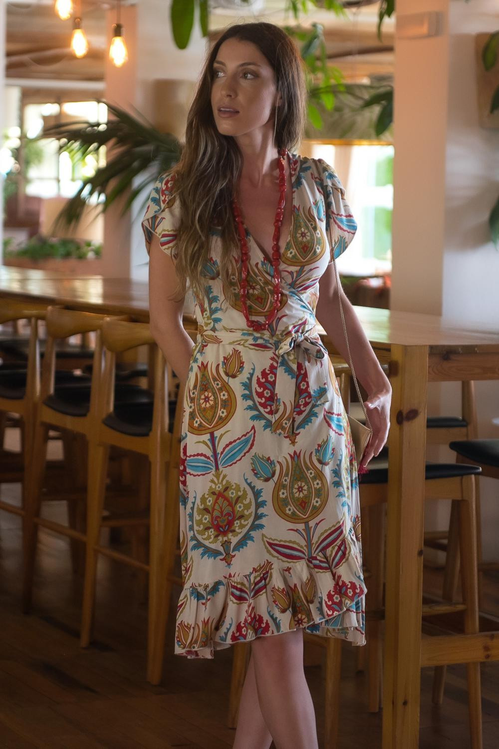 Vestido maxi con escote halter, cinturilla elastica y volantes en e bajo. espalda semidescubierta con multi tirantas. Tejido en polisilk y estampado floral en tonos granates y verdes sobre fondo marfil Sunset &...