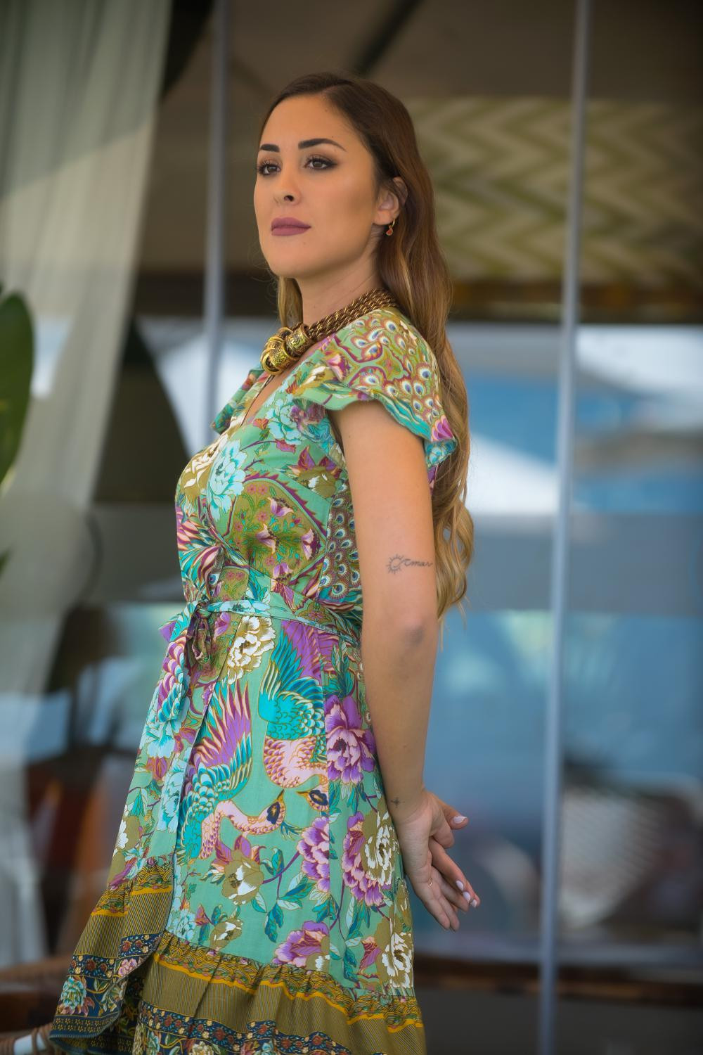 Vestido cruzado en satén media manga abullonada con doble flecos color caldera y estampado de fondo color piedra y hojas verdes y flores caldera.COMPOSICIÓN: 100%POLIESTER