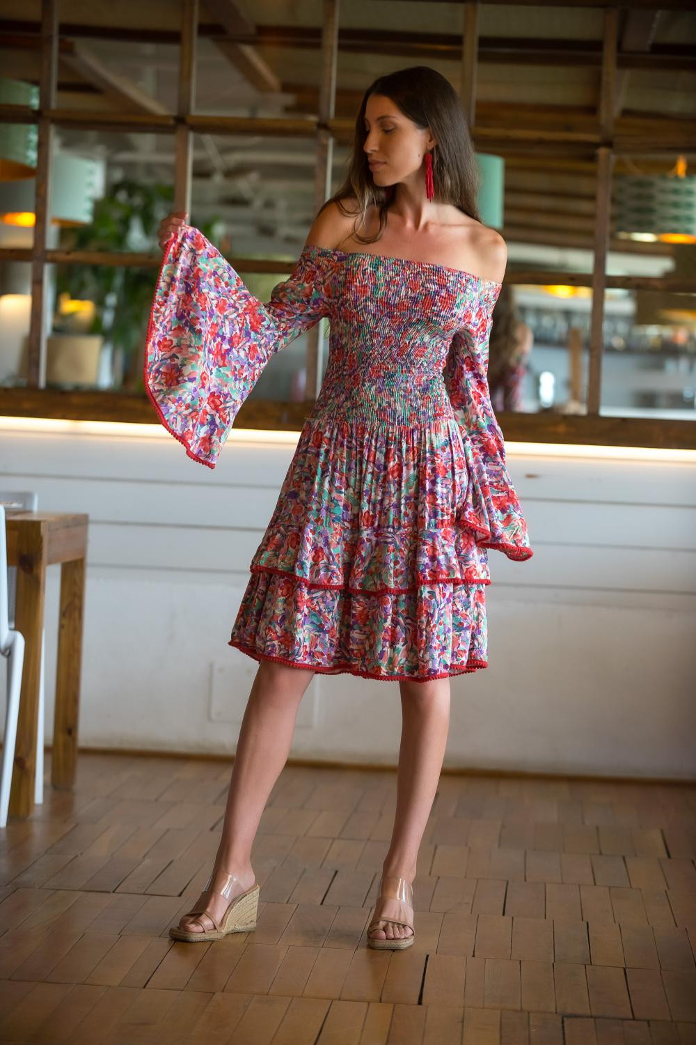 Top en color azul de media manga con doble volante capa y cuello drapeado columpioCOMPOSICIÓN: 70% POLIESTER 30% SEDA