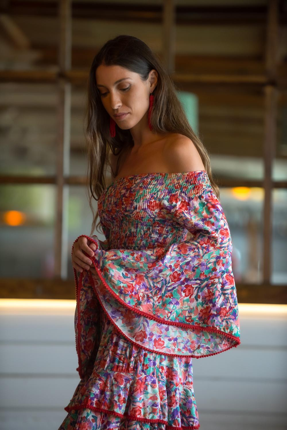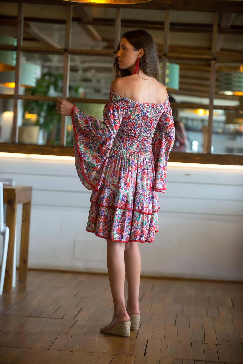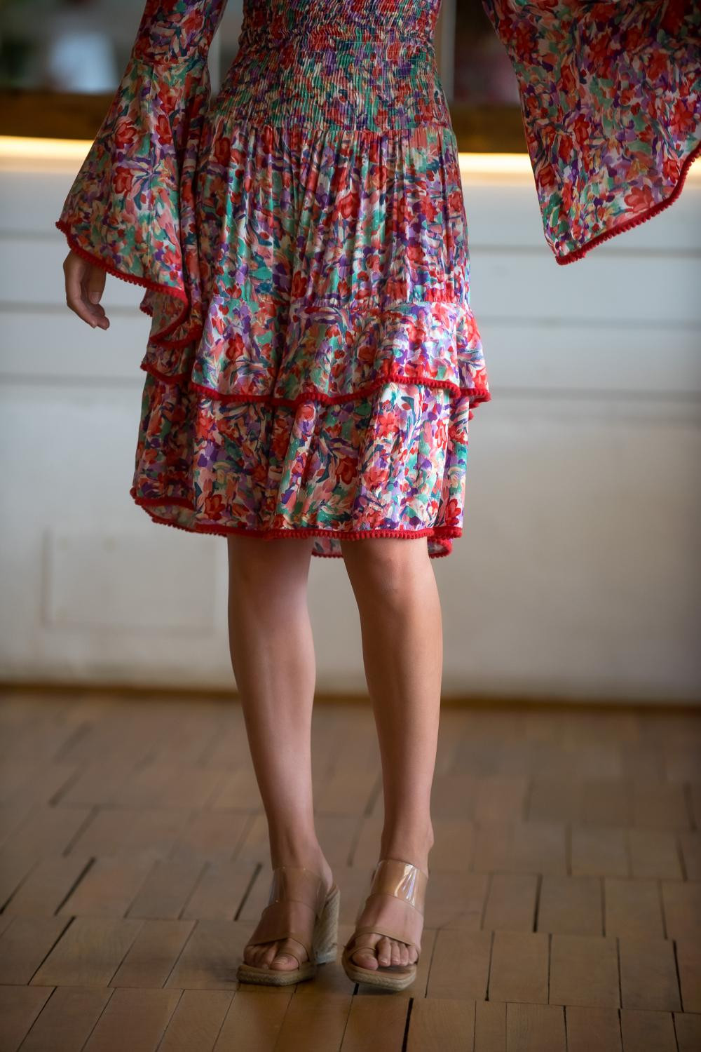 Vestido corales de polysilk fondo coral con lunares en beige, corto de manga larga cruzado con volante.CALIDAD: 70% POLIESTER 30% SEDA