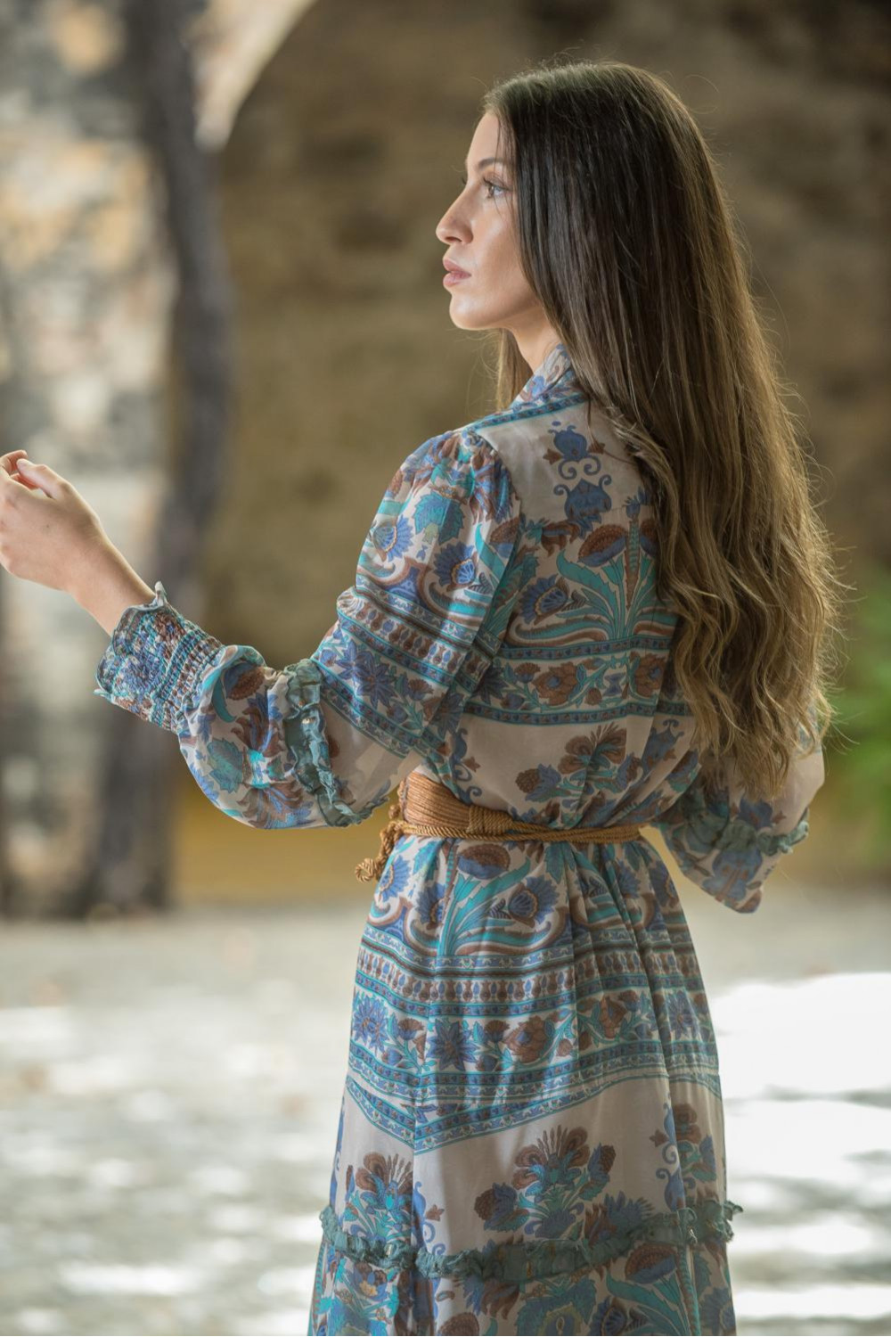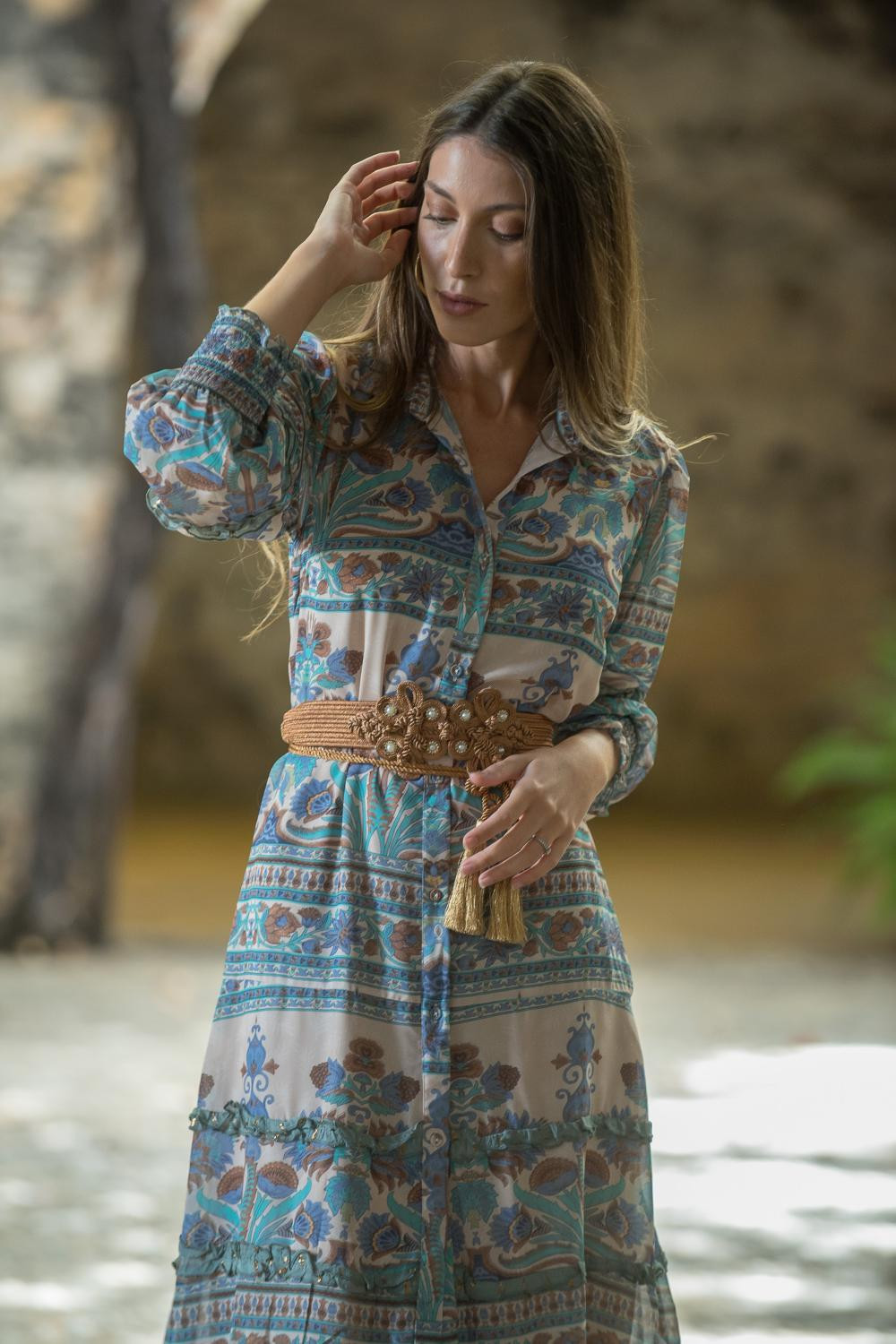 Vestido corto camisero estampado Roma, mangas abullonadas largas y volantito Aqua en falda
