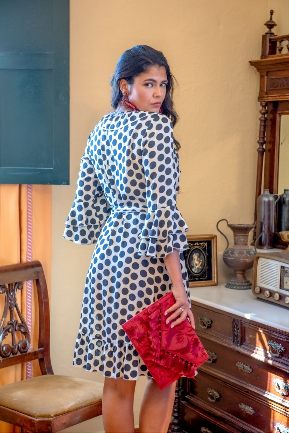 Vestido solera de polysilk fondo crudo y lunares negros, corto de manga larga cruzado con volante.