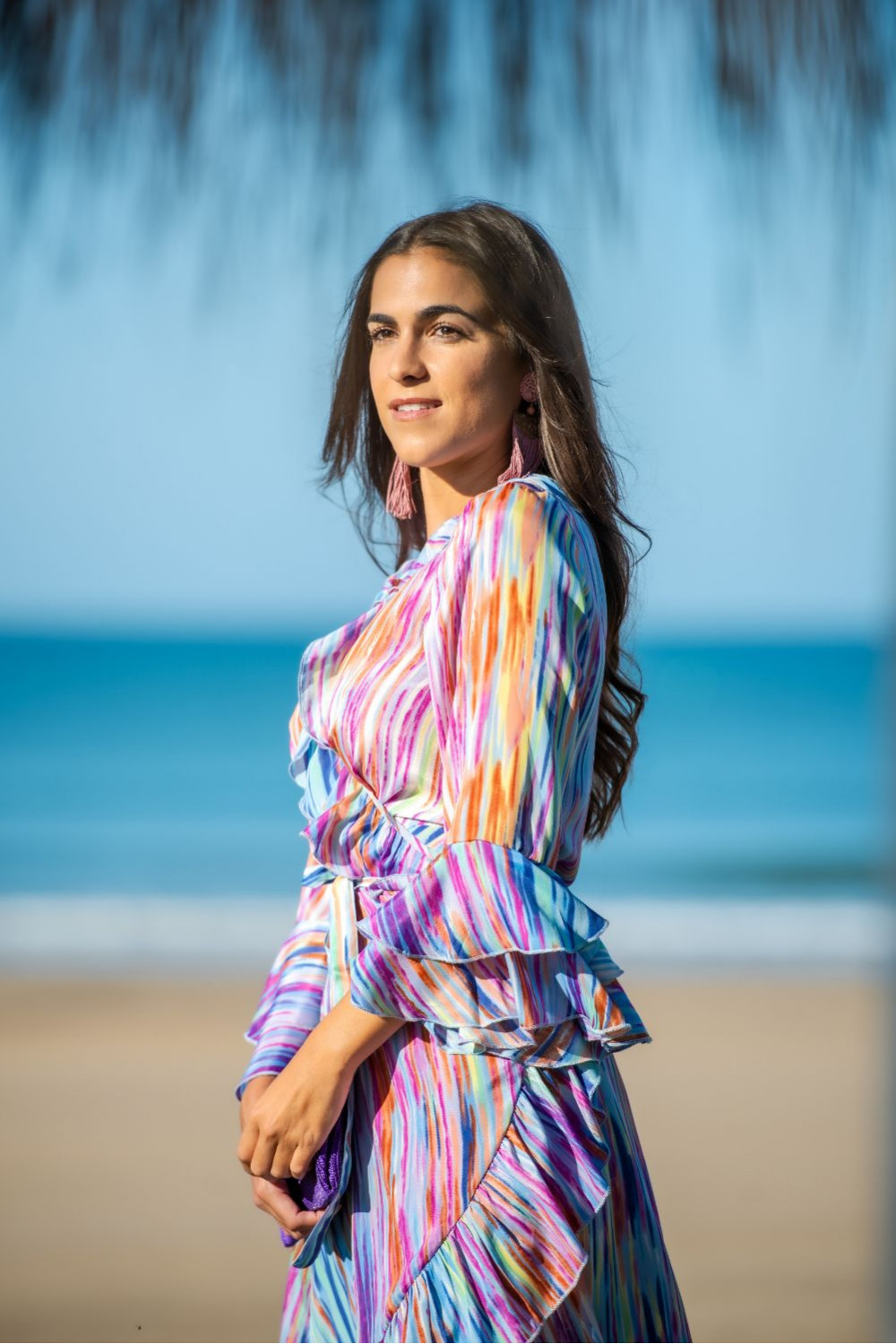 Vestido sigri corto de polysilk estampado crudo con rombos en corales y verde agua, de manga corta y escote v fruncido para ajustar a los hombros.CALIDAD: 70% POLIESTER 30% SEDA