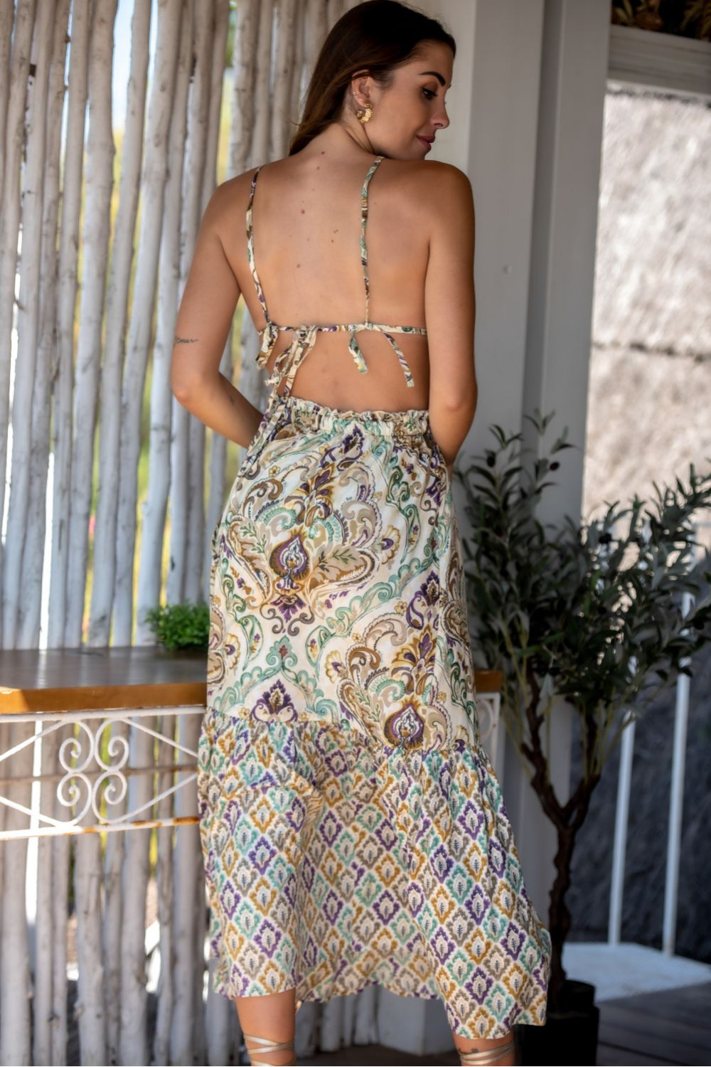 Vestido murano largo de viscosa estampado de fondo beige con gran cachemira en tonos verdes y malvas combinado con estampado ornamental en los mismos tonos, delantero en panal de abeja elástico ajustable al pecho con la espalda descubierta y tirantas que ajustan.