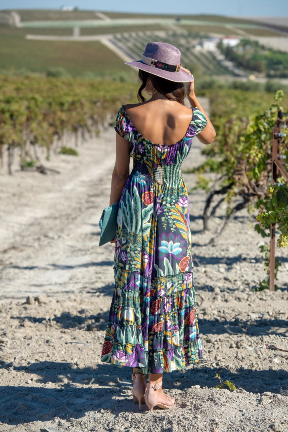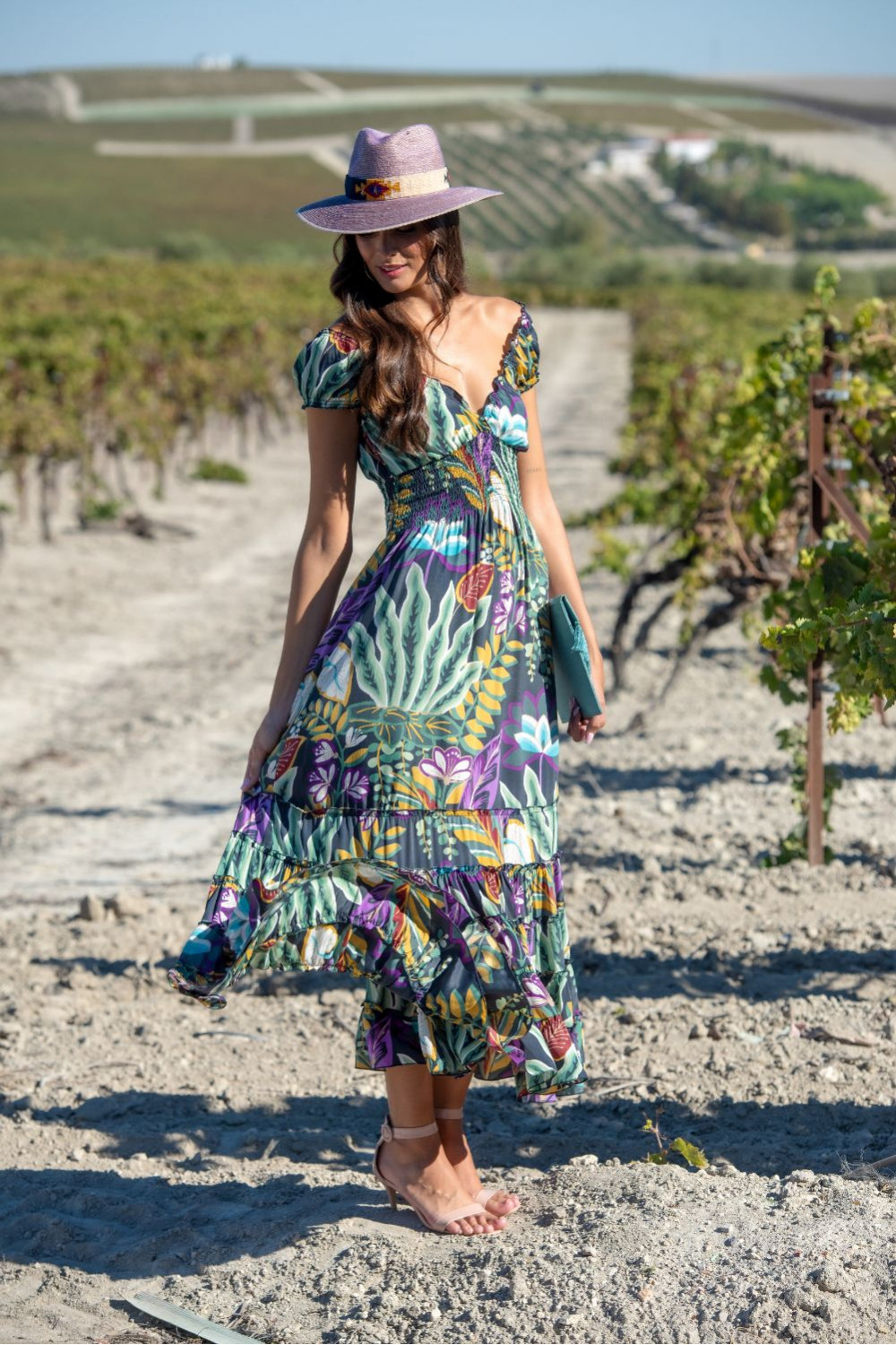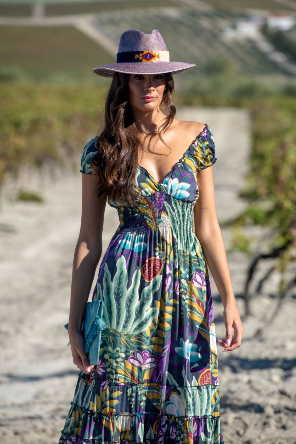 Vestido azteca cruzado de polysilk estampado de fondo negro con figuras geométricas en verde agua y coral largo sin manga cruzado con volante de capa en el bajo.CALIDAD: 70% POLIESTER 30% SEDA