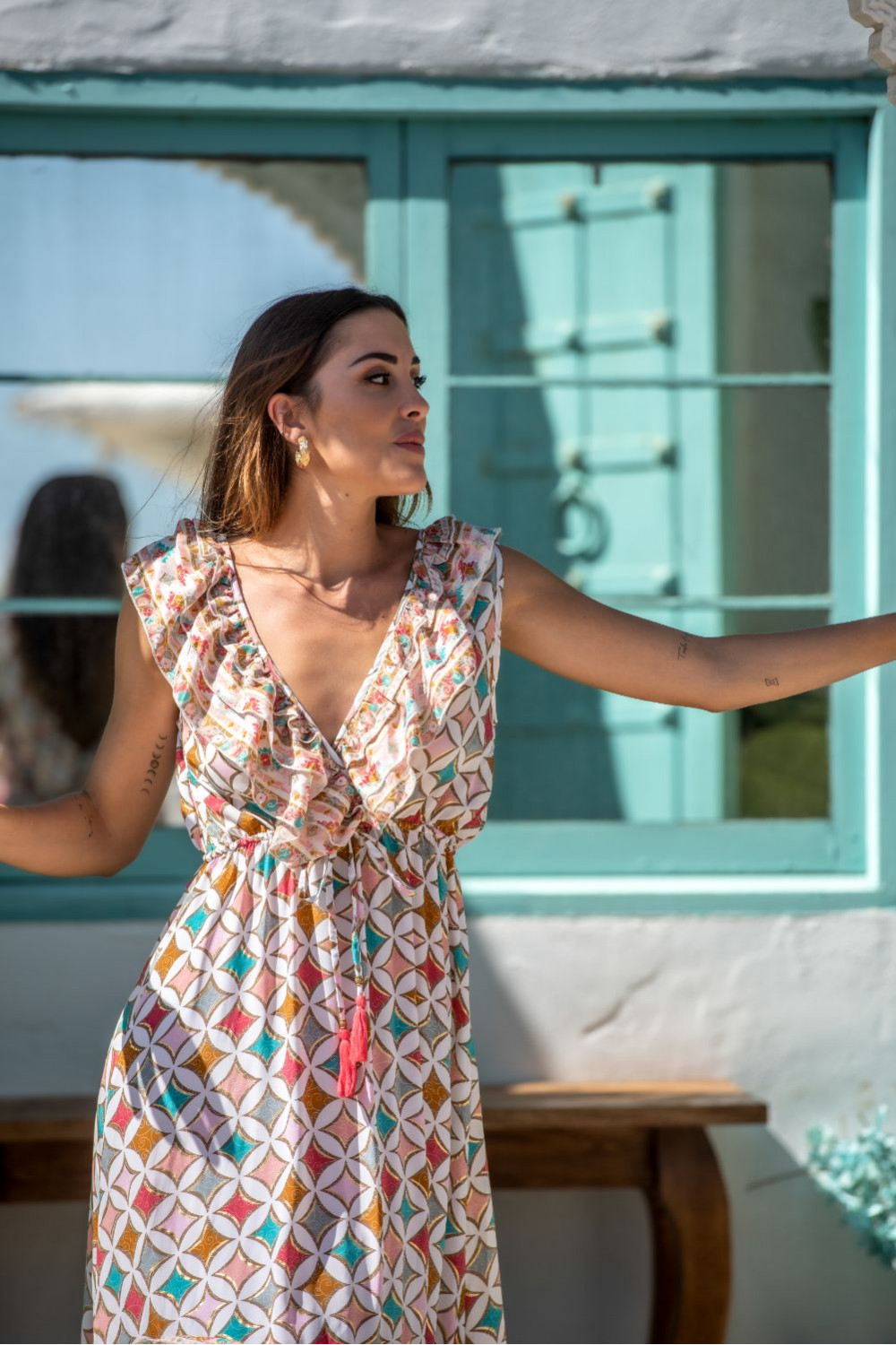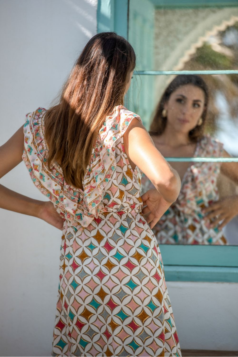 Vestido largo estampado Rosal, negro con flores rosas, sin mangas, escote atado con cinta terminado en borlones, cintura fruncida elástica y falda franjas patchworkCOMPOSICIÓN: 100% VISCOSA
