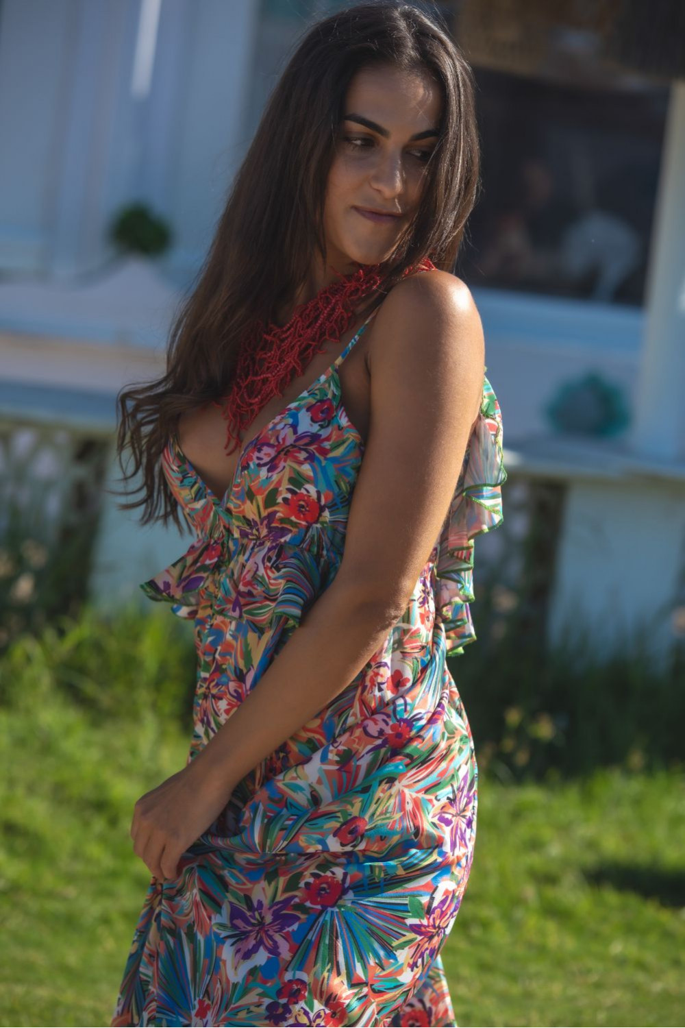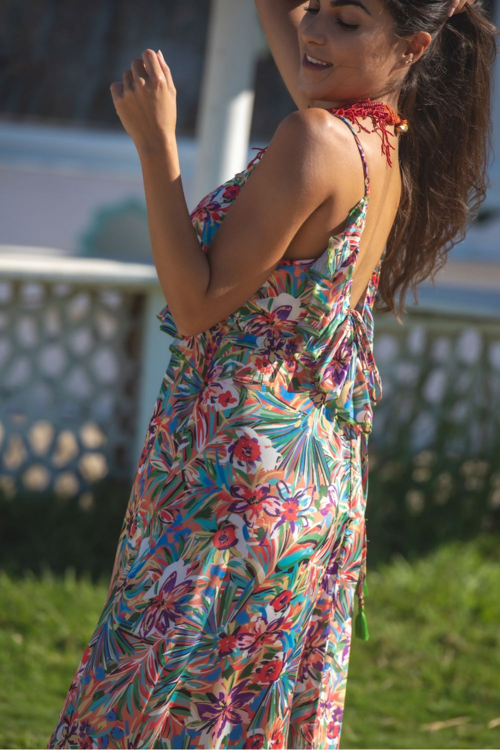 Mono santorini polysilk estampado de cachemira naranjas, verde agua y mostazas fondo fucsia ,pata ancha con volante en la manga ajustable y escote en v delantero y en la espalda.CALIDAD: 70% POLIESTER 30% SEDA