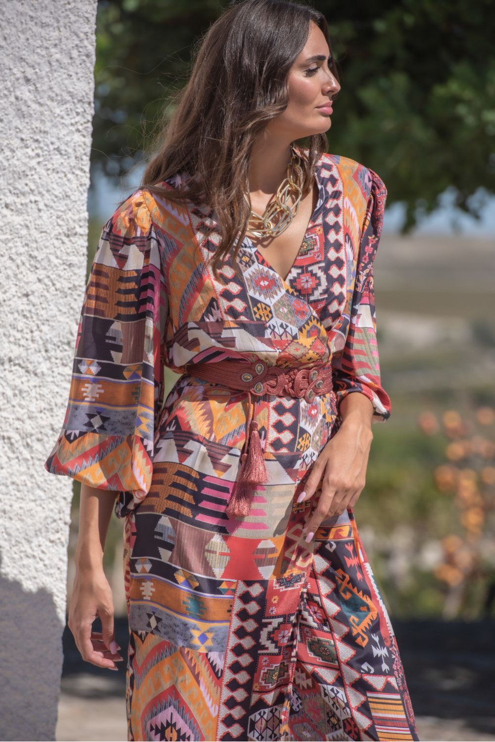 Vestido gala kaftan gasa en estampado de guepardo en tonos verdes, tierras, negros con lurex dorados escote pico con lentejuelas plateadas, cuerpo ablusonado con mangas japonesas, cintura fruncida con adornos de...