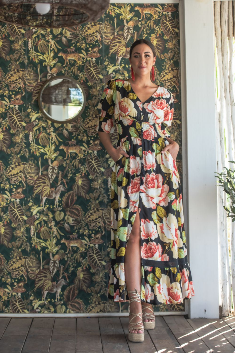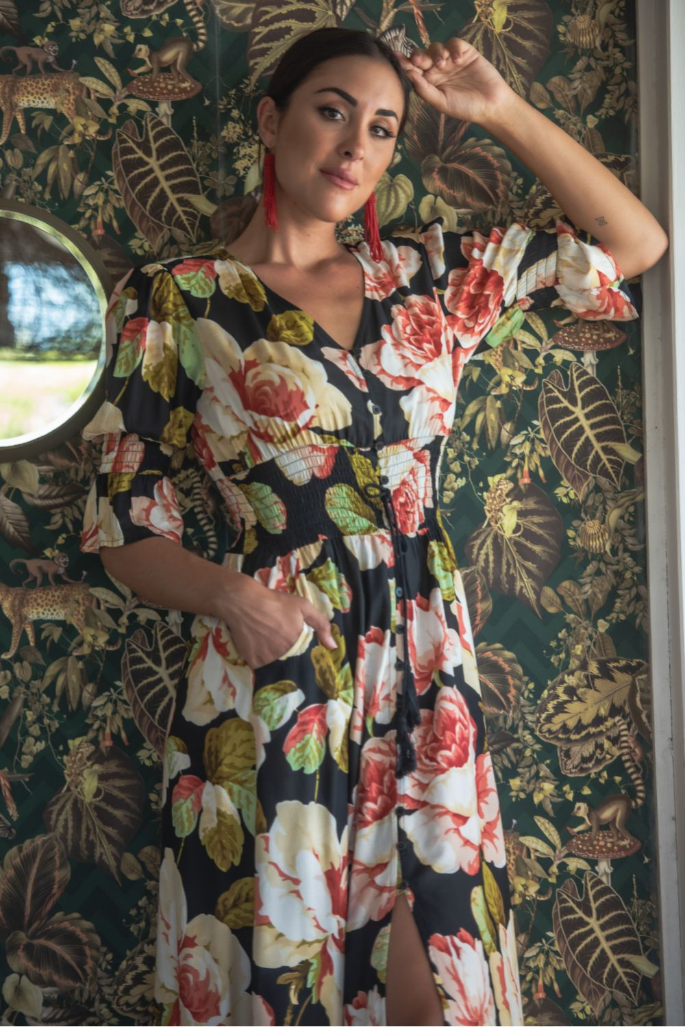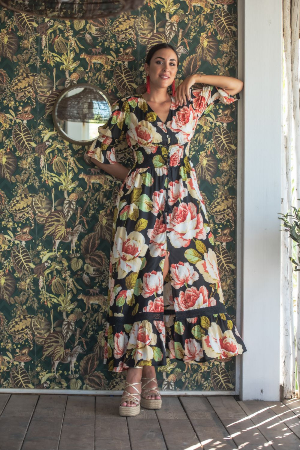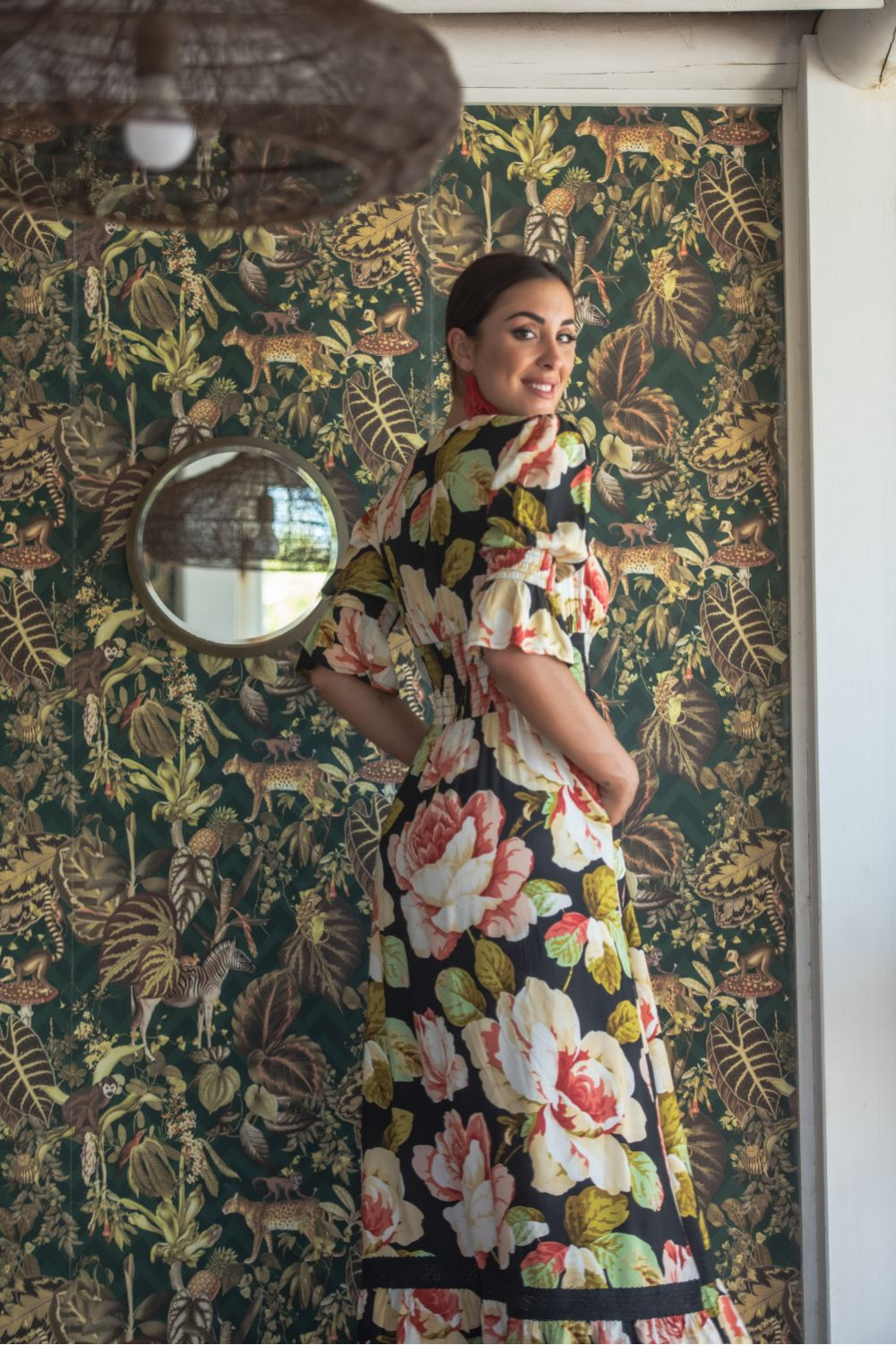 VESTIDO HONDA MOSAICO DE SATEN CORTO Y MANGA LARGA CON CINTURA ELASTCA Y MANGA GLOBO ADORNADO CON CARRUCHITAS