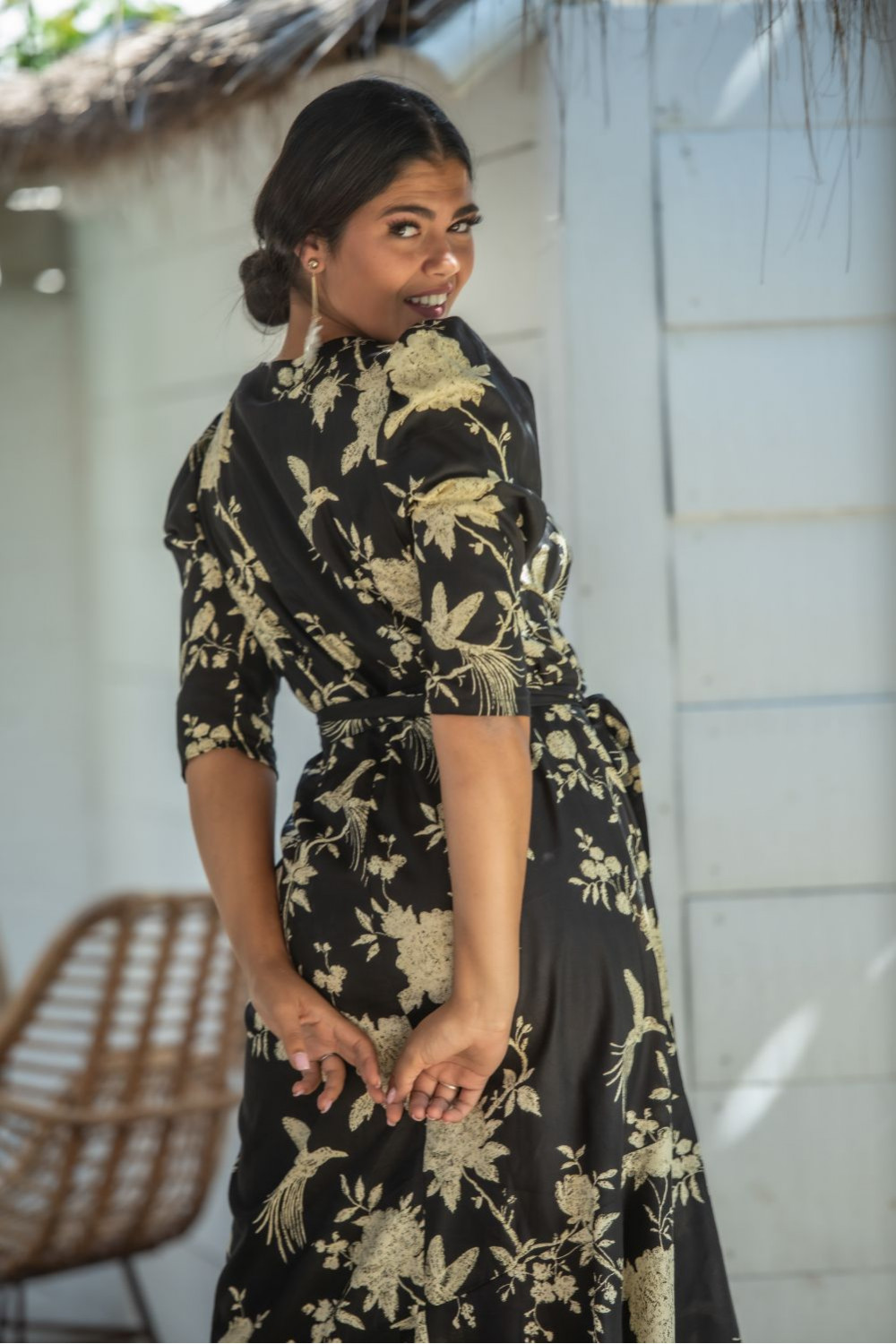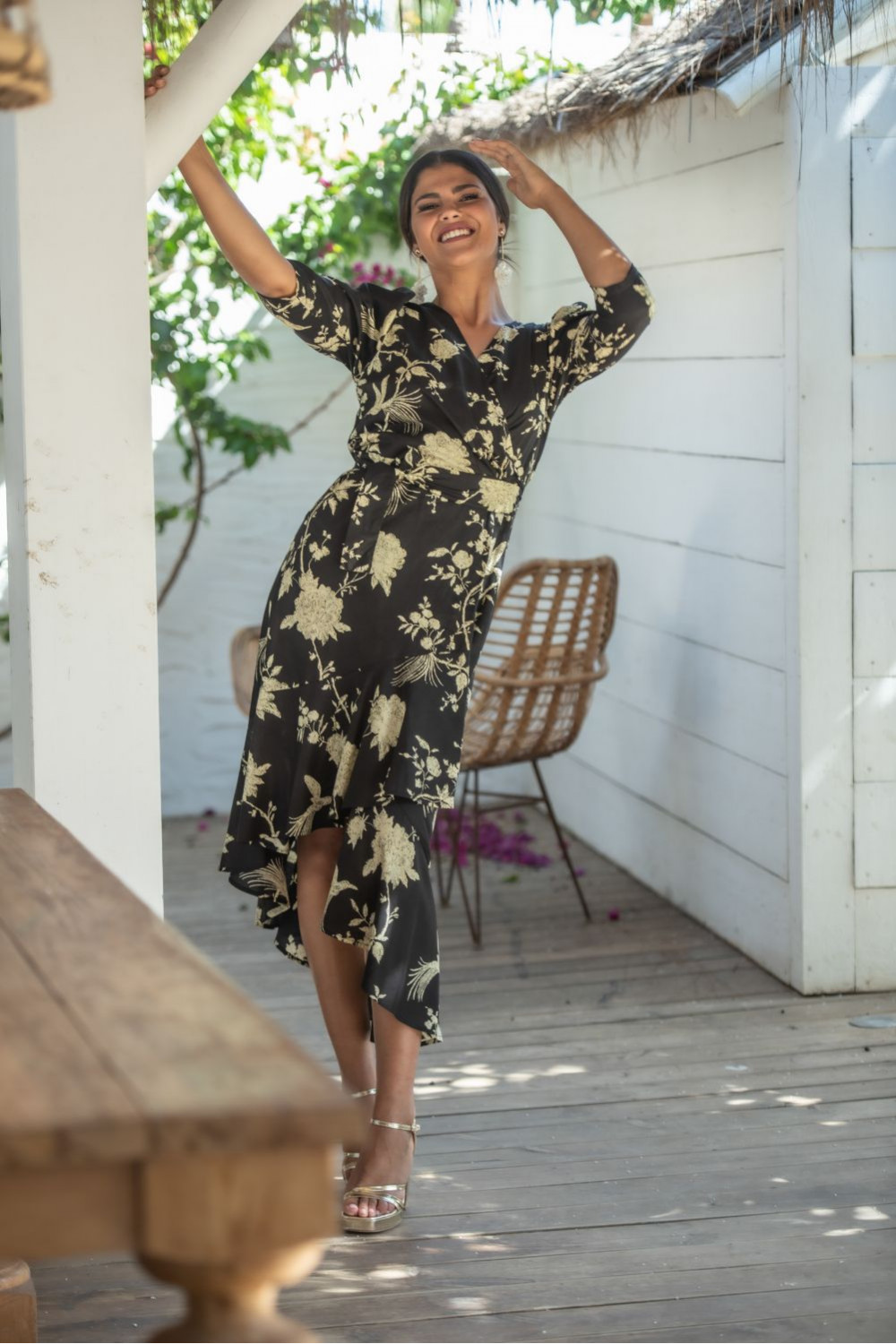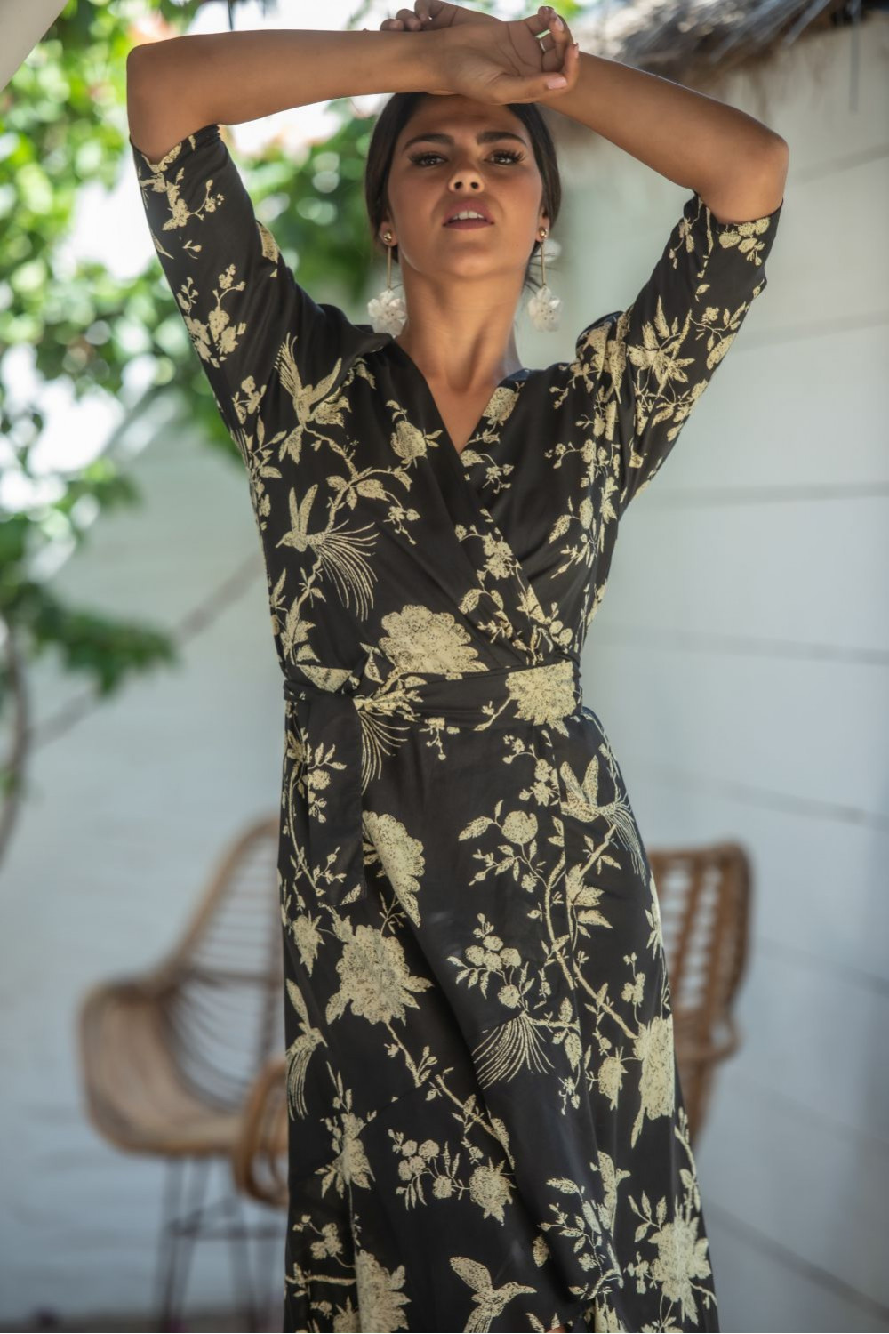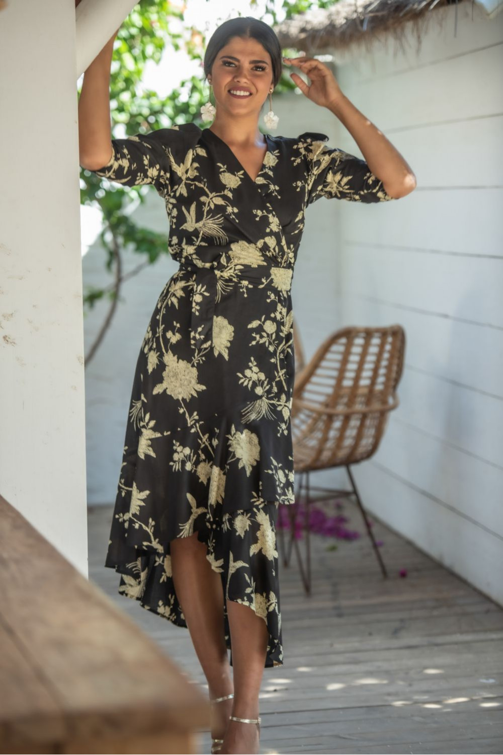 Vestido sarmiento de polysilk fondo negro y estampado de grandes flores y patwork naranjas largo sin mangas cruzado y atado en la cintura.CALIDAD: 70% POLIESTER 30% SEDA