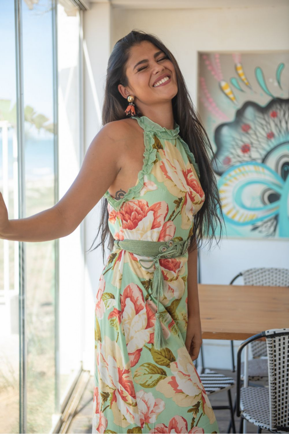 Vestido formentera garrucha gasa en el cuello y sisa en viscosa estampado verde agua con grandes rosas color maquillaje largo sin manga.