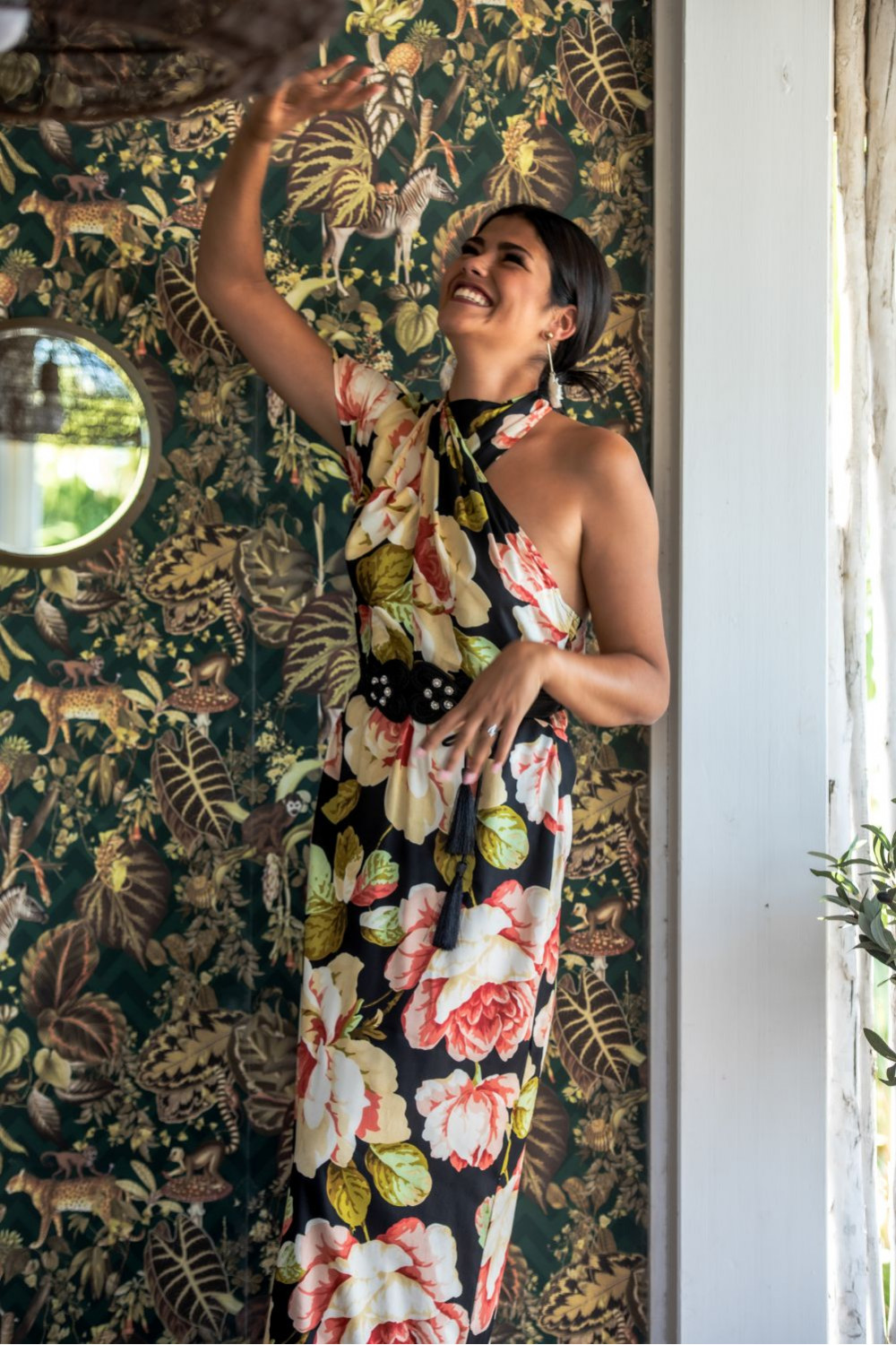Vestido elba cuello anudado pañuelo en viscosa estampado de fondo negro con grandes rosas en tonos maquillaje y coral.