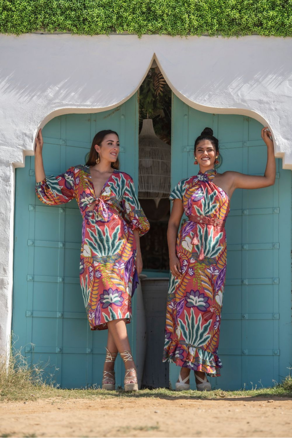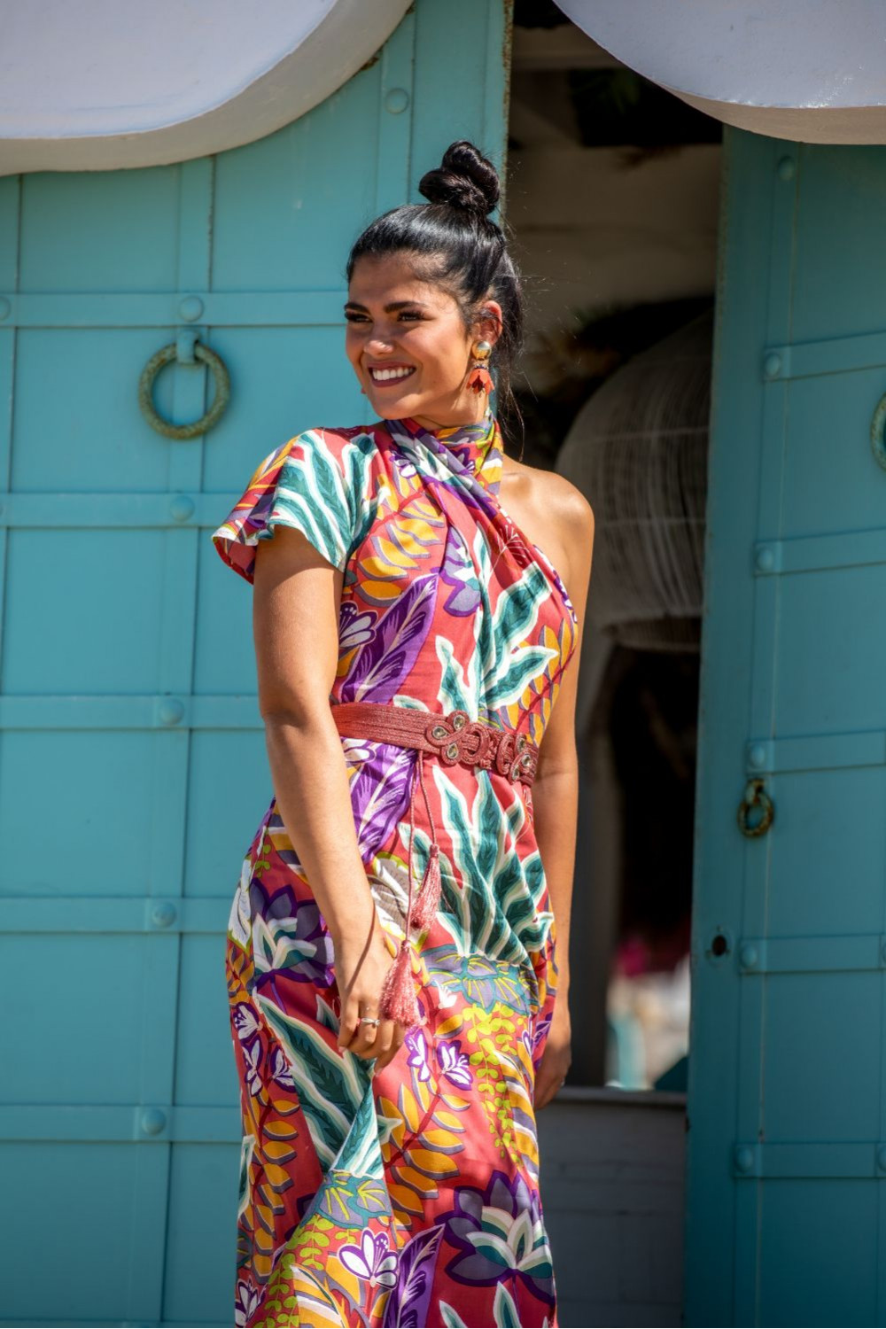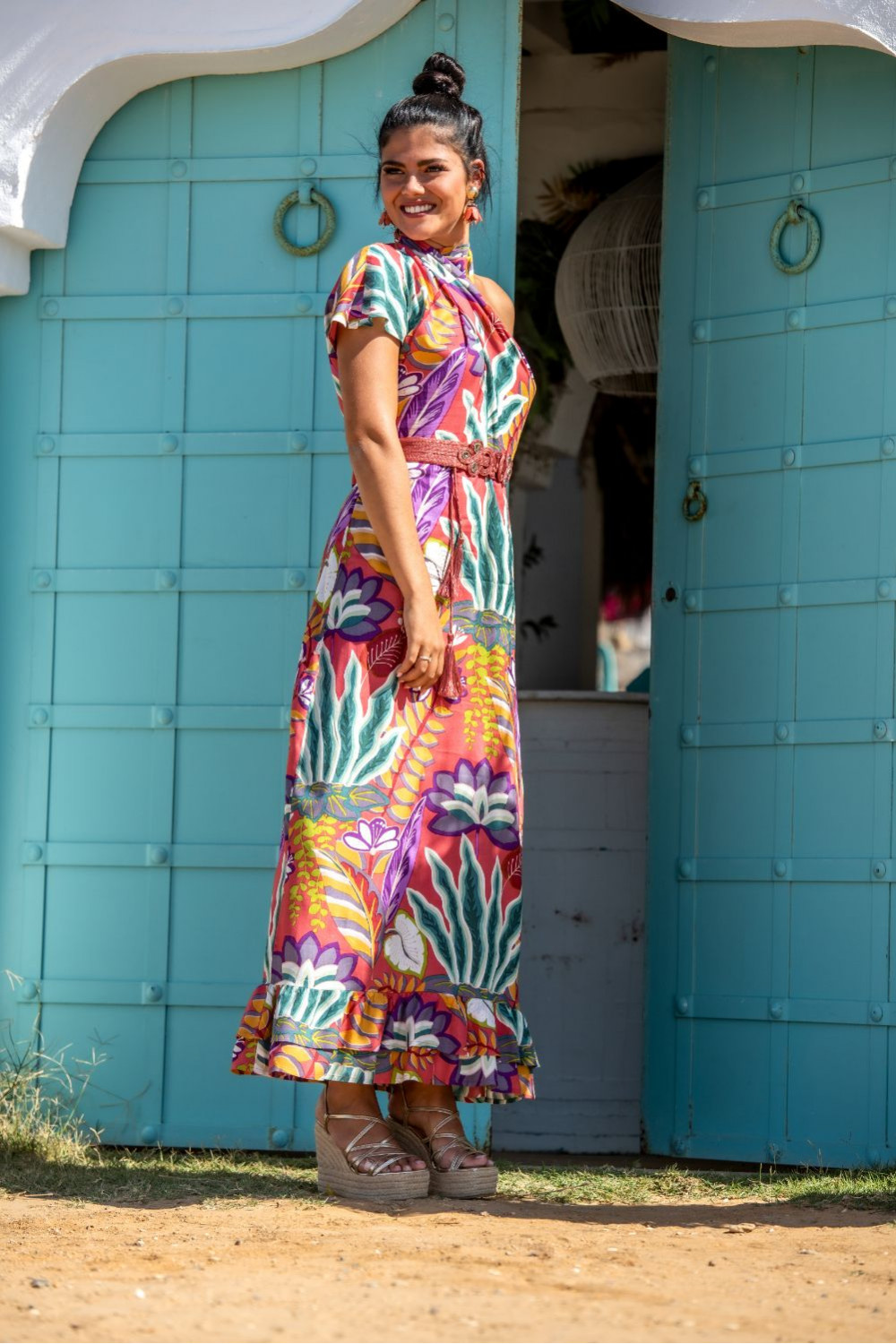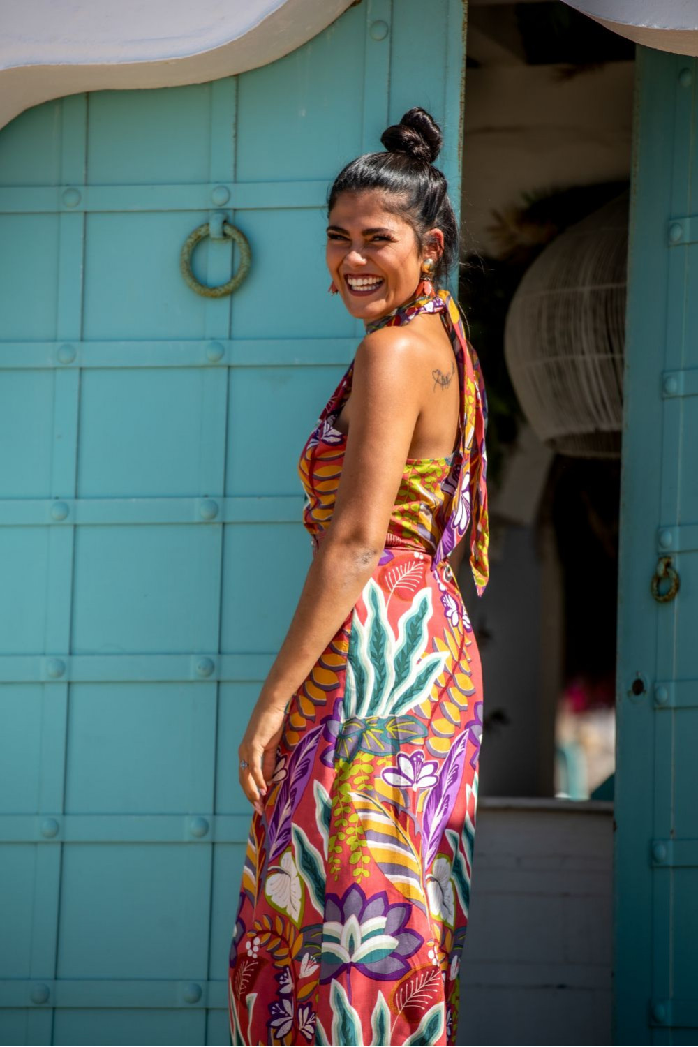 Vestido sarmiento de polysilk fondo negro y estampado de grandes flores y patwork naranjas , azules y verdes espalda descubierta con tiras fruncidas , cuello halte.CALIDAD: 70% POLIESTER 30% SEDA