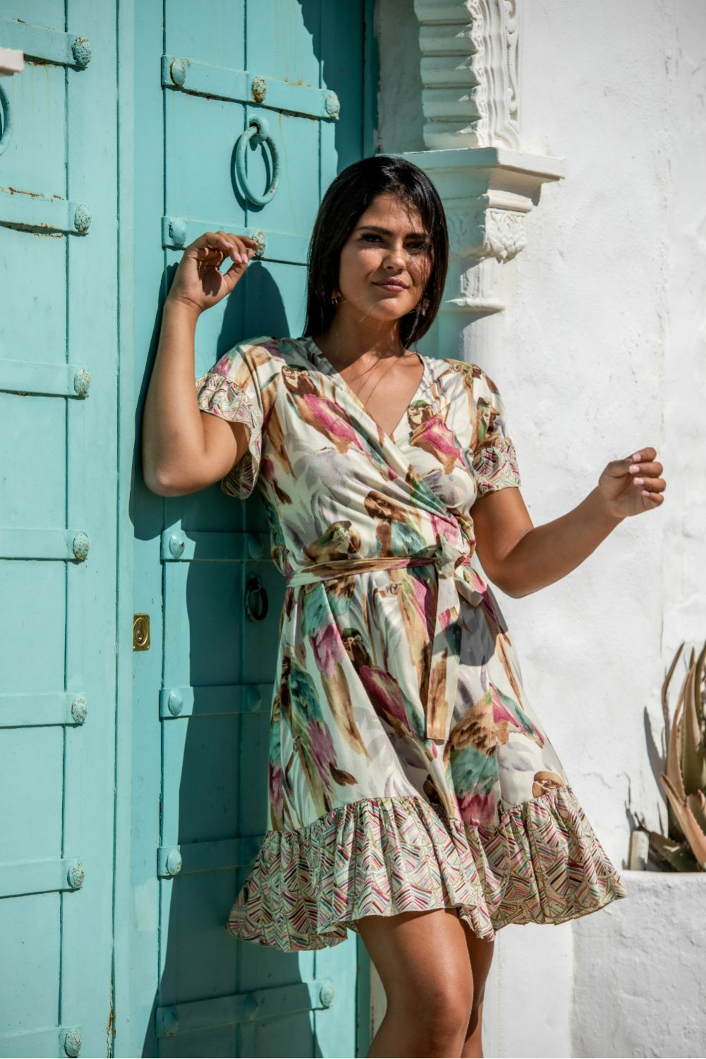 Vestido largo estampado Granada con motivos mosaicos en tonos coral, escote y espalda en pico, terminado con encaje de bolillo, cintura fruncida con borlonesCOMPOSICIÓN: 70% POLIESTER 30% SEDA