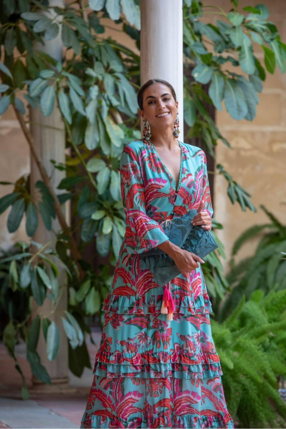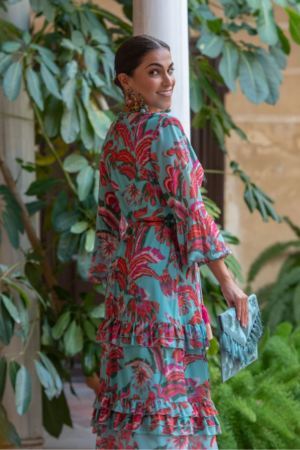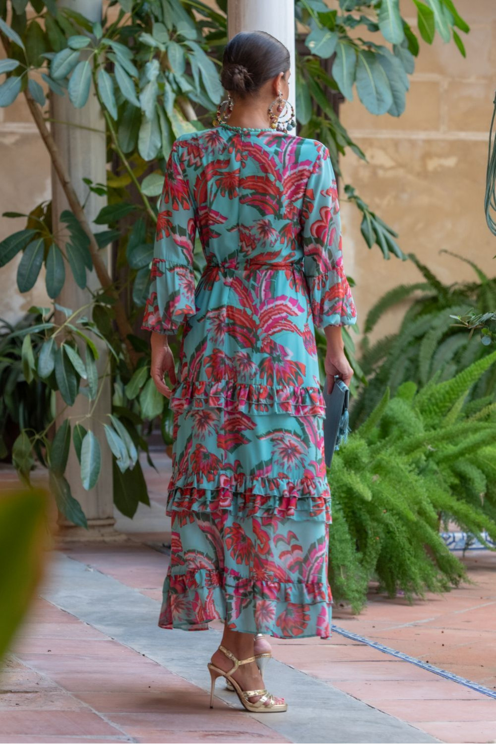 Vestido guacamayo en viscosa túnica estampado crudo con guacamayos en tonos pastel y combinado con estampado haciendo hojas en volantes laterales.CALIDAD: 100% VISCOSE