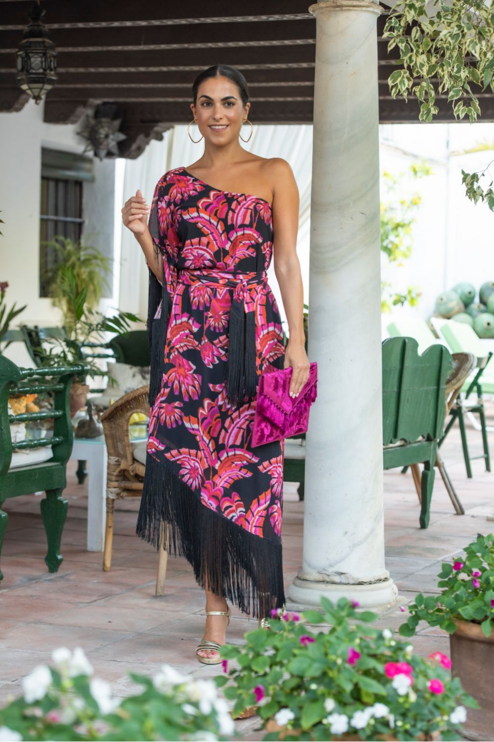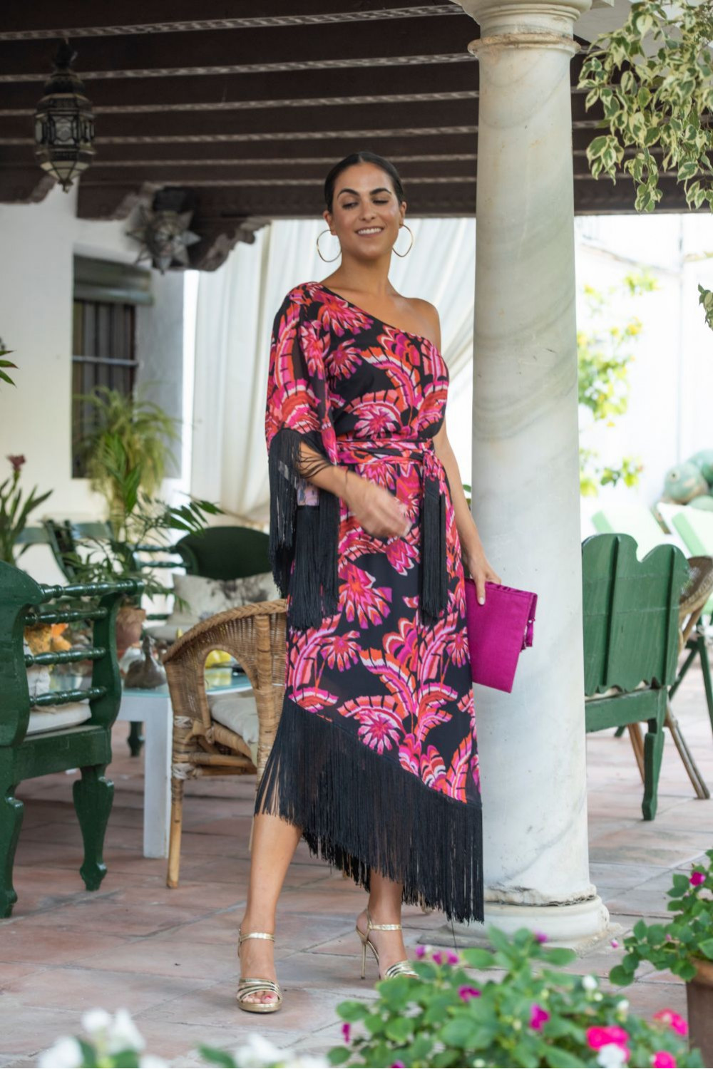 Vestido soleá beige de gasa bordado en flores de mantón rosas escote asimétrico sin manga y flecos al tono en el bajo y en el lazo que ajusta la cintura.CALIDAD: GASA - 100% POLYESTER