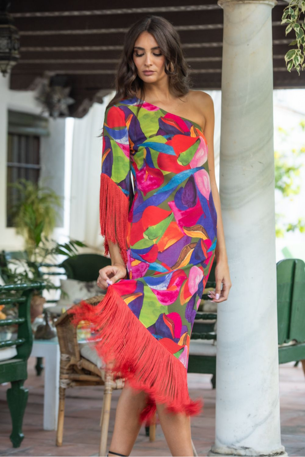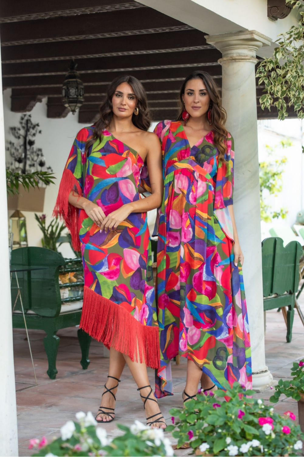 Vestido brasil gasa corto asimétrico con flecos de estampado flores grandes en fucsias, rojos, verdes.