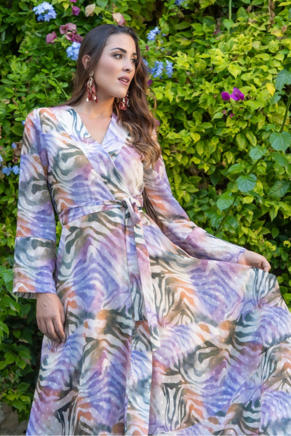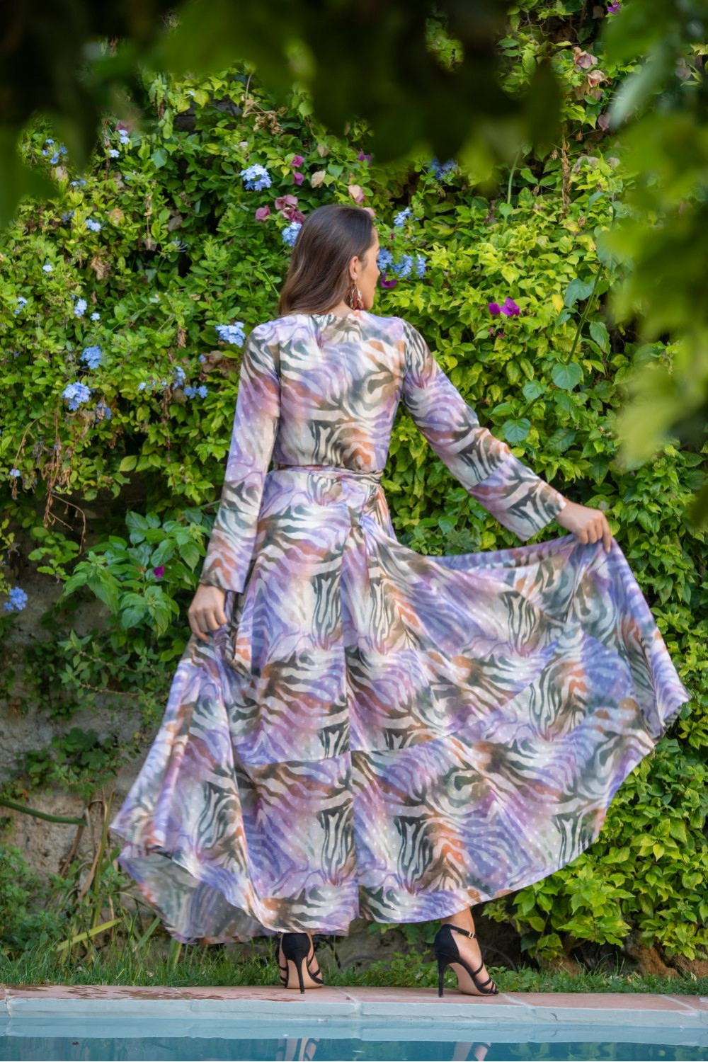 Vestido ariel cruzado en gasa plumeti estampada animal print en tonos malvas ,beige y verde cacería manga larga y volante gran capa en el bajo.