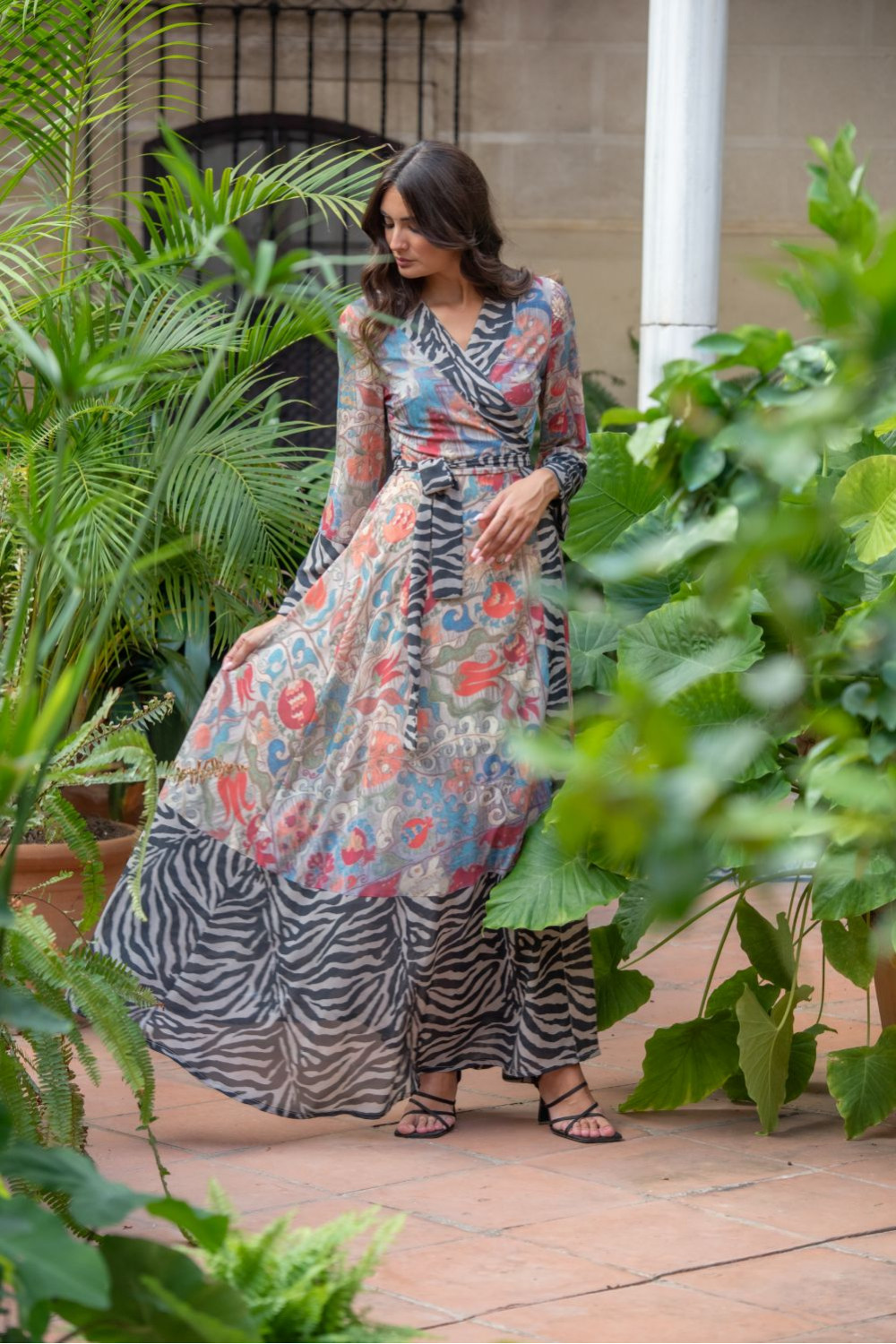 Vestido mudéjar de polysilk estampado con motivos de alfombra en tonos tierras y burdeos, manga larga abullonada con puño y escote cruzado.CALIDAD: 70% POLIESTER 30% SEDA