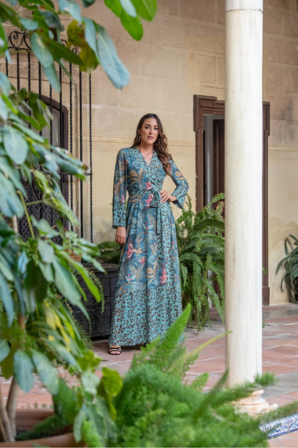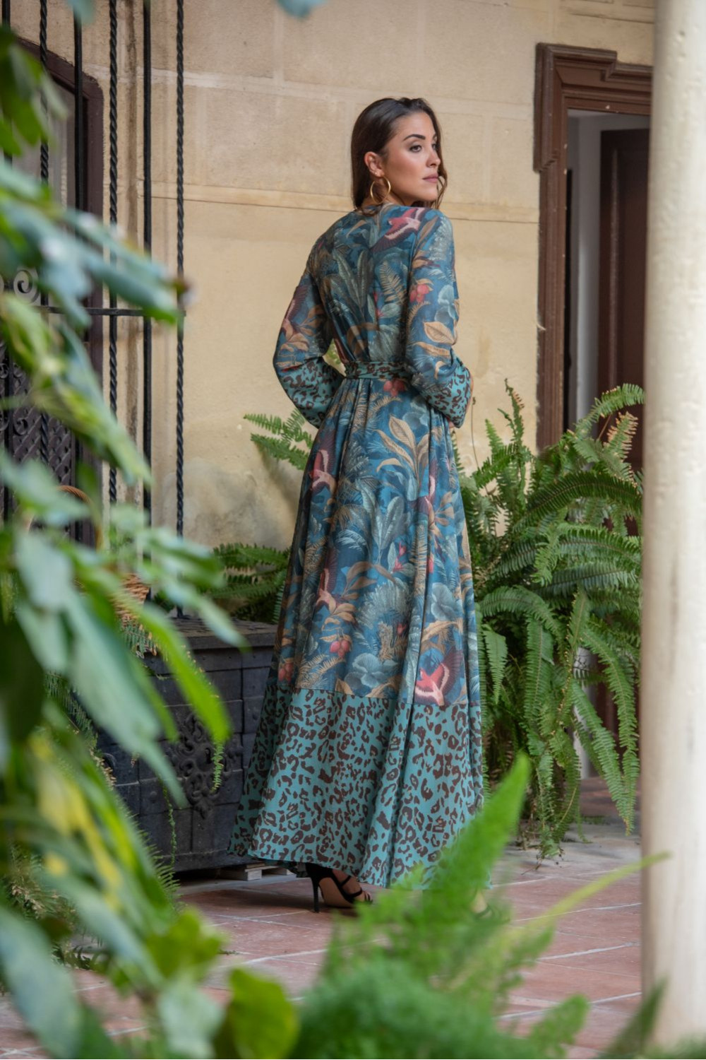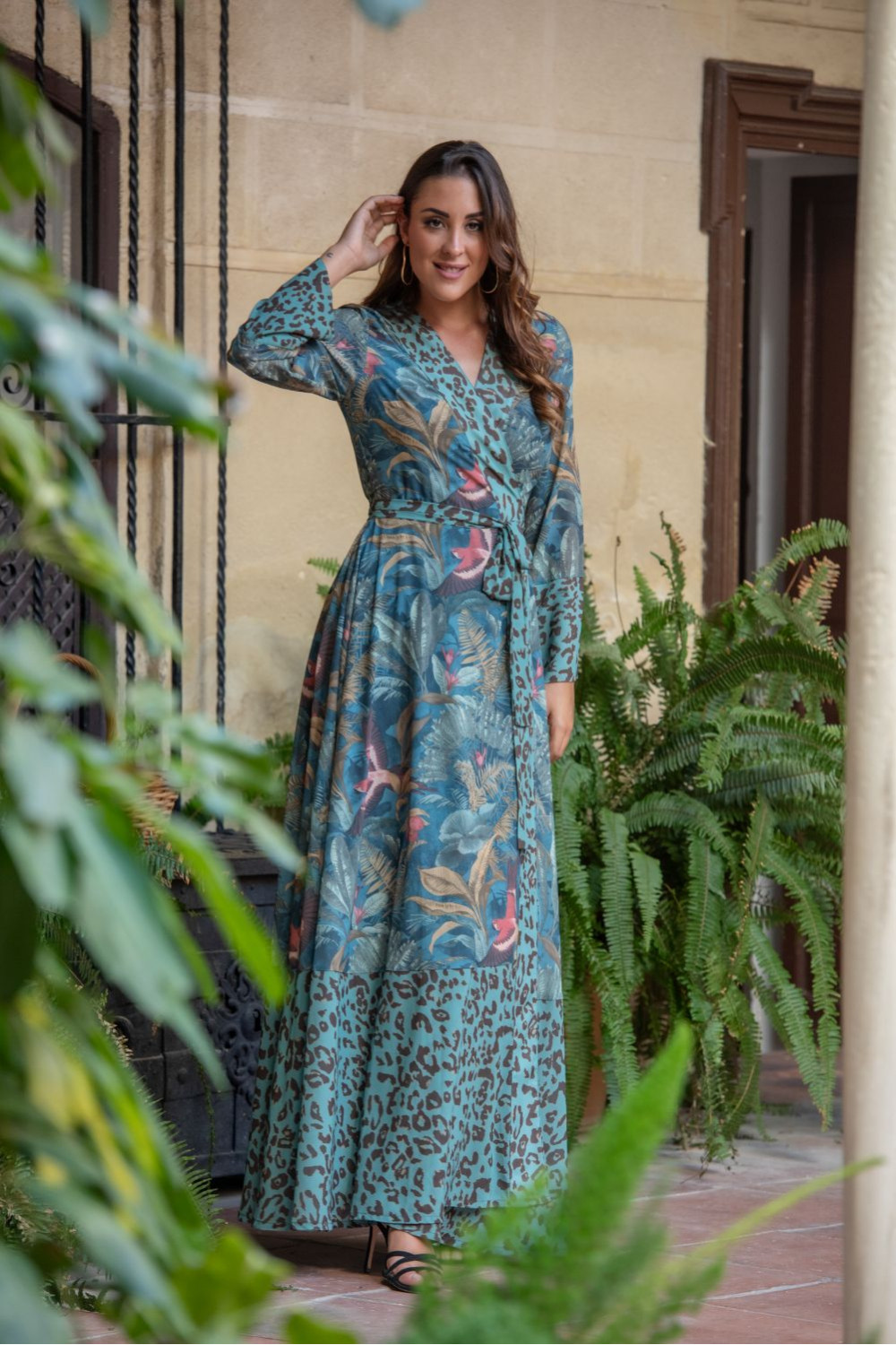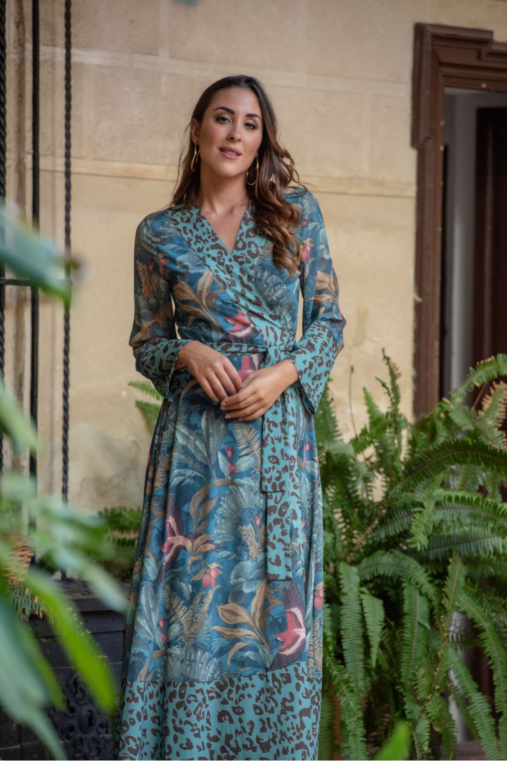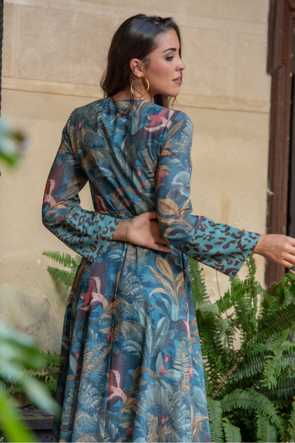 Vestido magalí cruzado gasa de estampado botánico verde junco con pájaro coral combinado con animal print de guepardo turquesa.