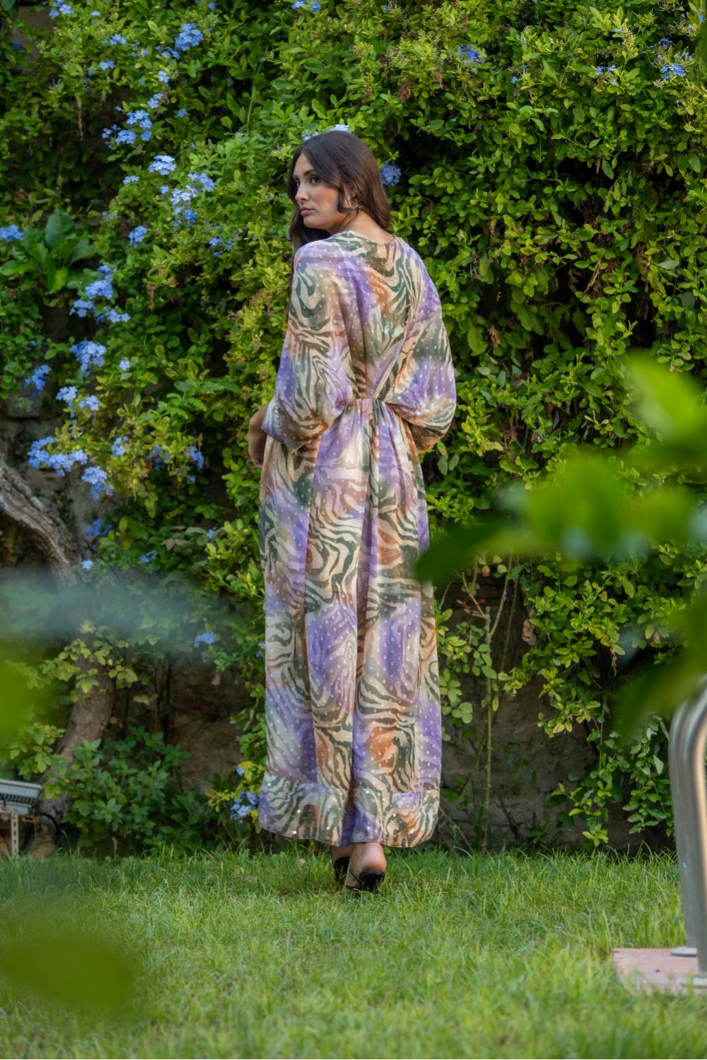 Referencia: PV2440AVestido ariel kaftan gasa plumeti estampada animal print en tonos malvas ,beige y verde cacería escote pico con lentejuelas plateadas, cuerpo ablusonado con mangas japonesas, cintura fruncida con adornos de flecos multi.