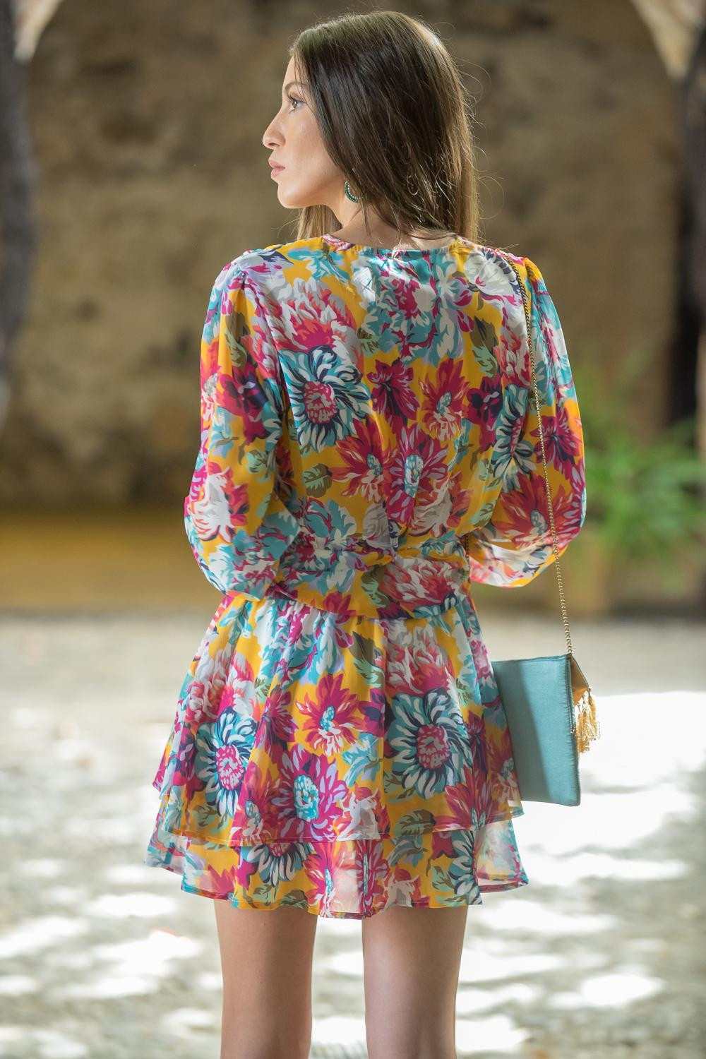 Vestido corto estampado Rosal negro con flores rosas, cuello halter y detalles de cintas de crochet , espalda descubiertaCOMPOSICIÓN: 100% VISCOSA