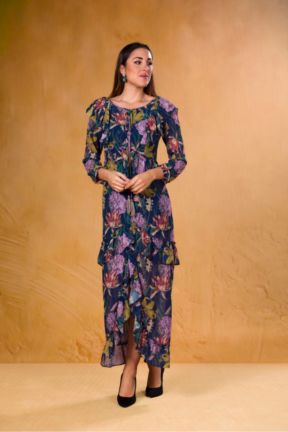 Vestido largo musa de gasa camisero en estampado ornamental tonos azules y marrones con manga abullonada y volante canastero combinado con estampado en tono azul.COMPOSICIÓN: 100% POLIESTER