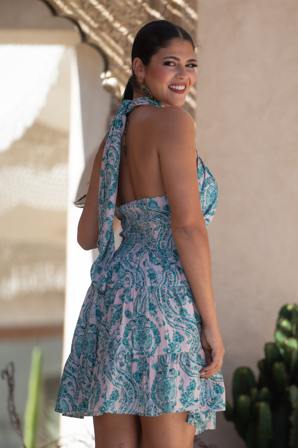 Vestido corto con cuello halter, corte en cintura y Falda de vuelo en polisilk con estampado en verde agua sobre blanco Sunset & Moon.