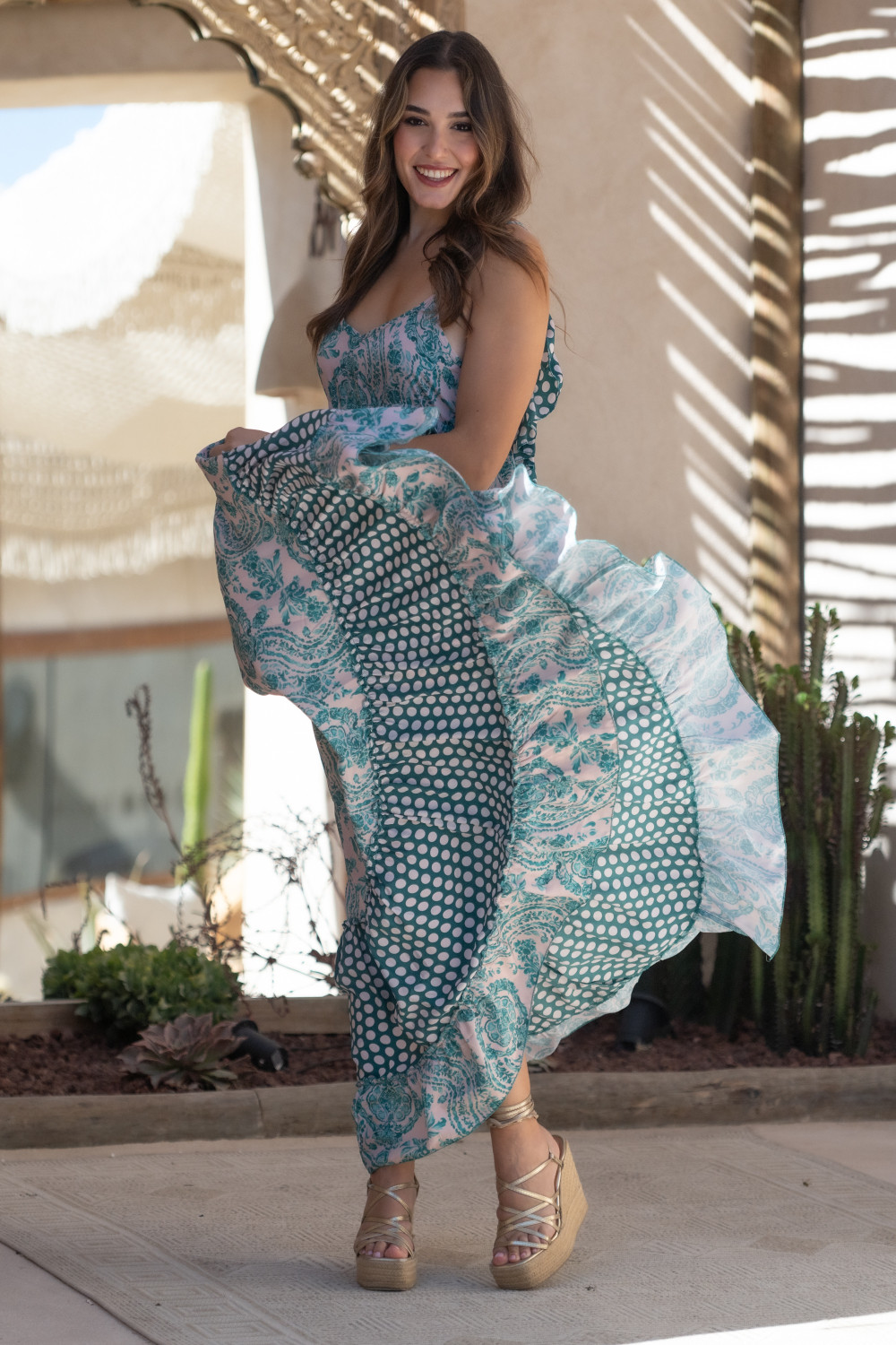 Referencia: PV2505CVestido maxi con prints combinados y detalle de volante bajo el pecho y en la espalda que queda parcialmente descubierta y con tirantas ajustables. Tejido de polisilk y estampado parsley en tonos verde agua combinado con lunar blanco y verde Sunset & Moon.