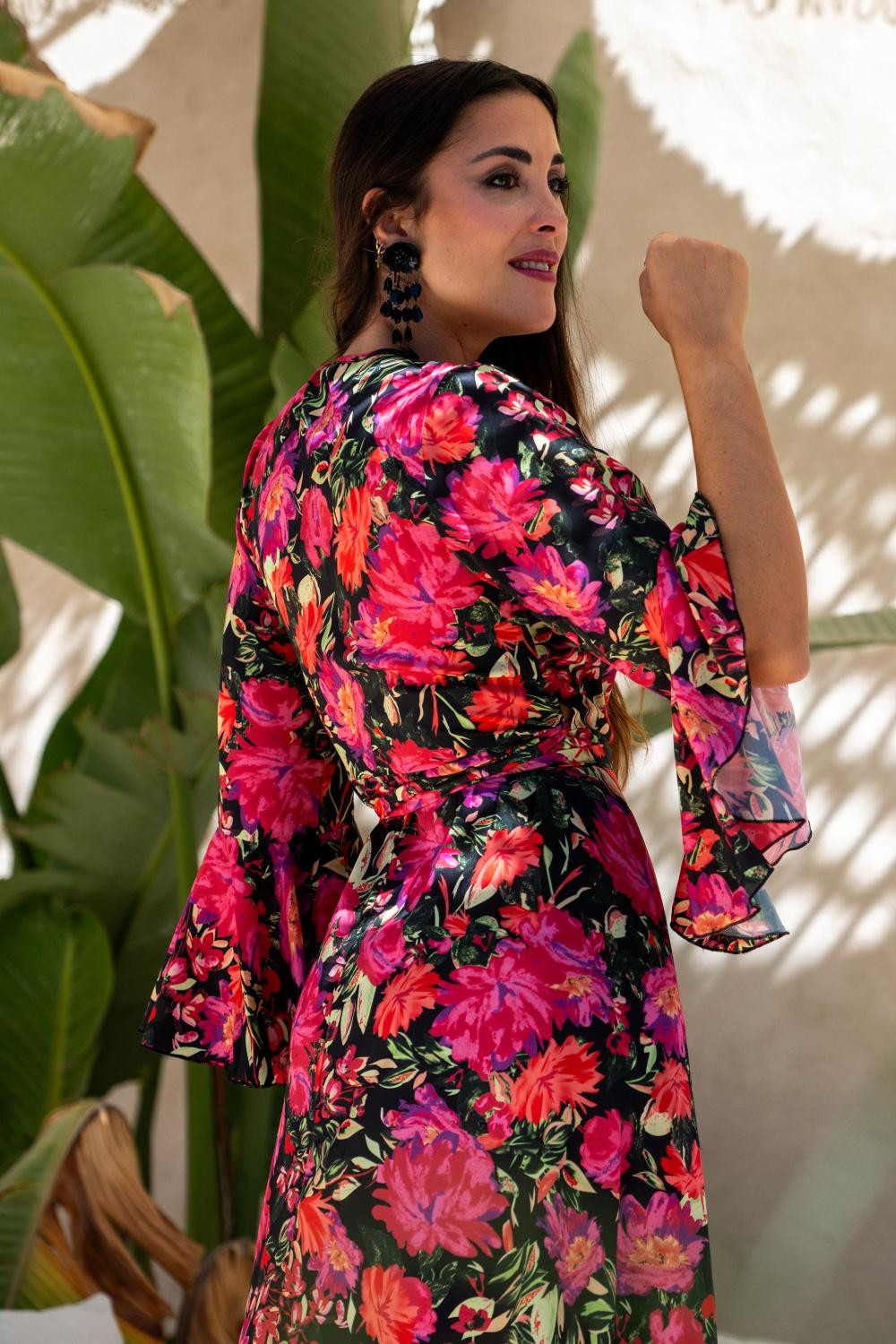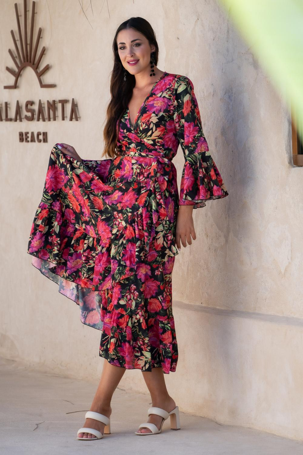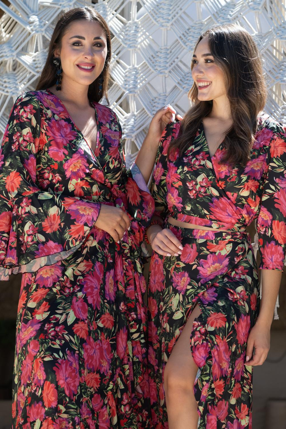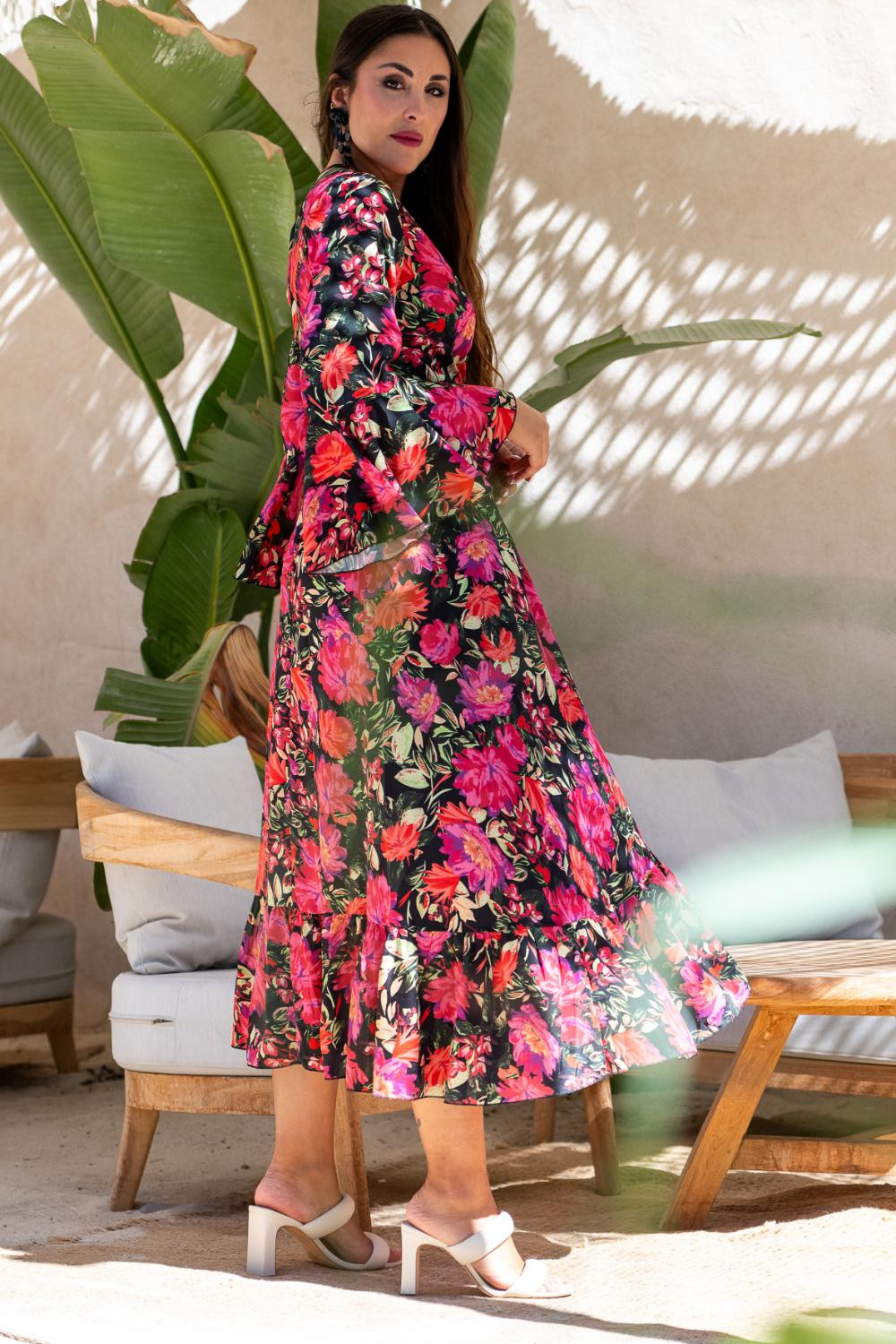 Vestido maxi cruzado y anudado en cintuta con volante en el bajo que sube hacia el cruce y manga campana acabada en volante de capa. Tejido en polisilk y estampado floral en tonos rosa y rojo sobre fondo negro Sunset & Moon.