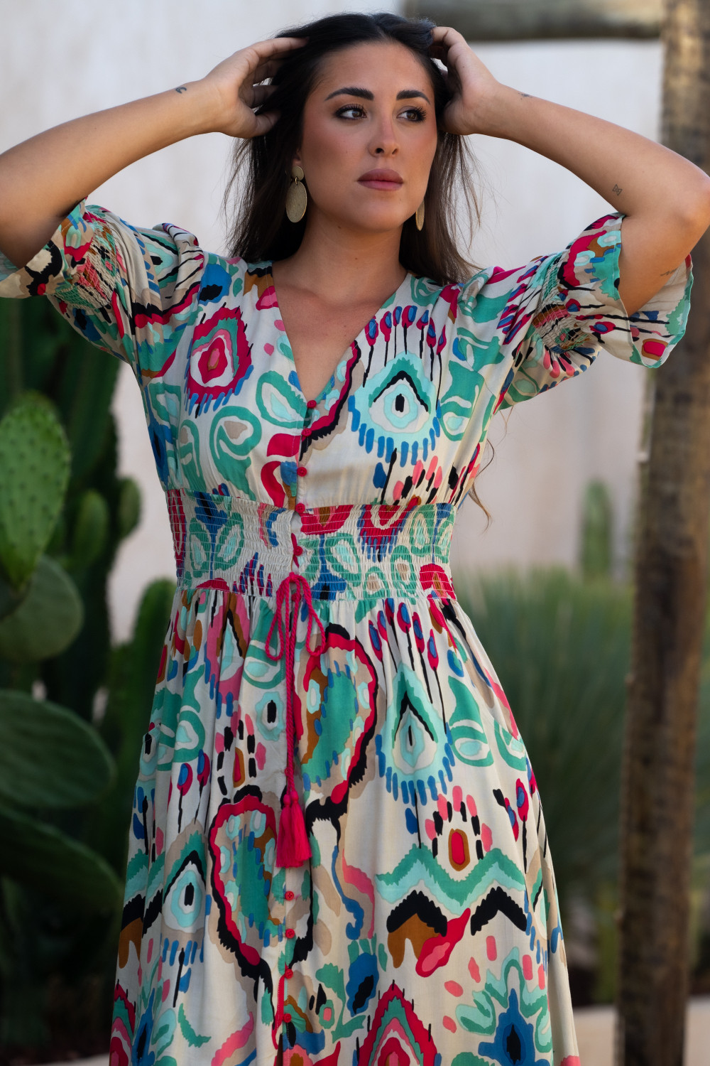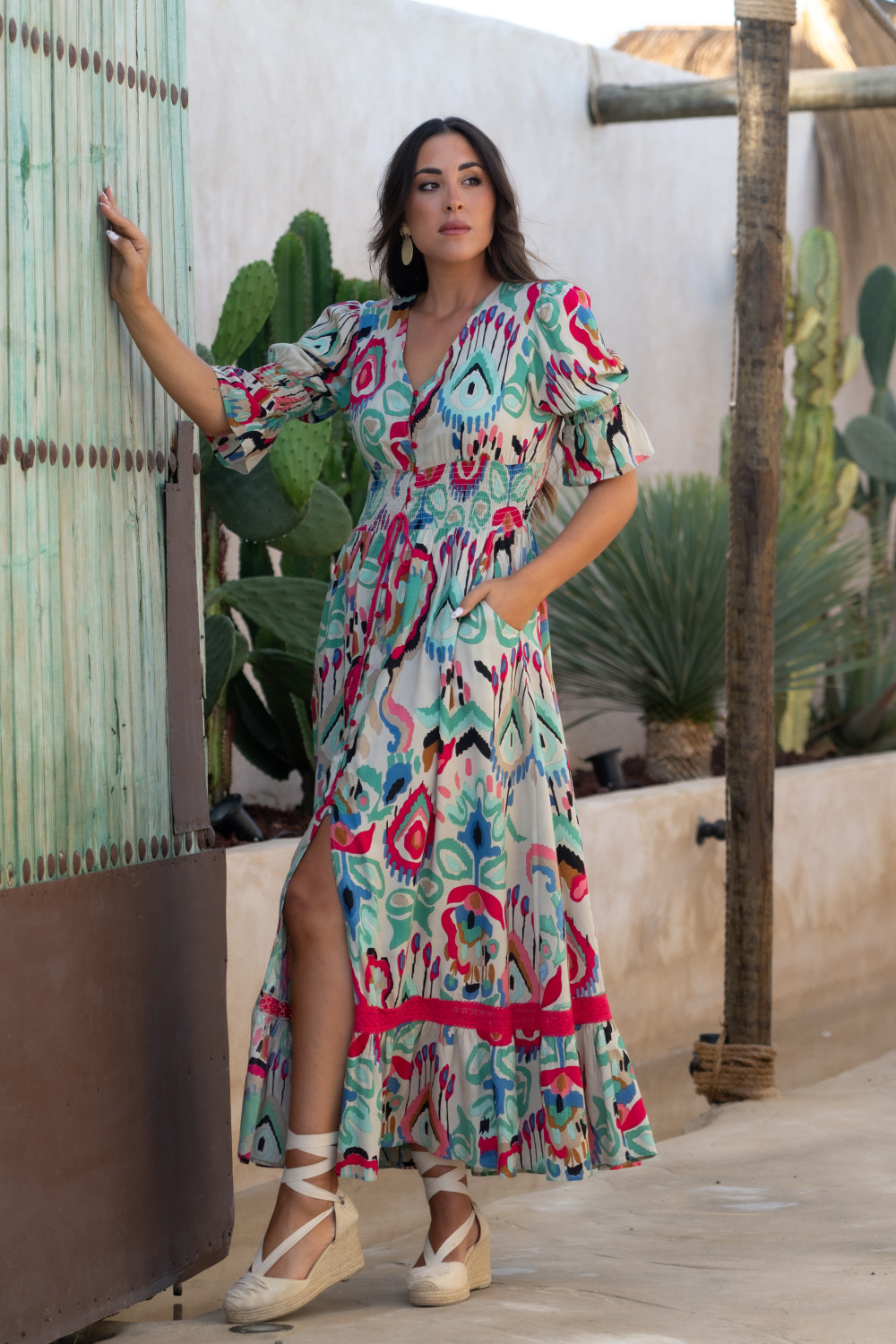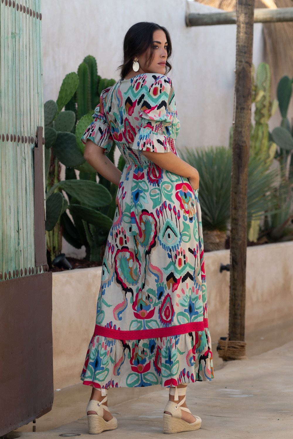 Vestido cerdeña leticia en viscosa estampado de lunares grandes en verde, morados y esmeralda, escote bañera con cuerpo elástico volante en el bajo y adorno de pasamanería morado en la cintura.CALIDAD: 100% VISCOSE