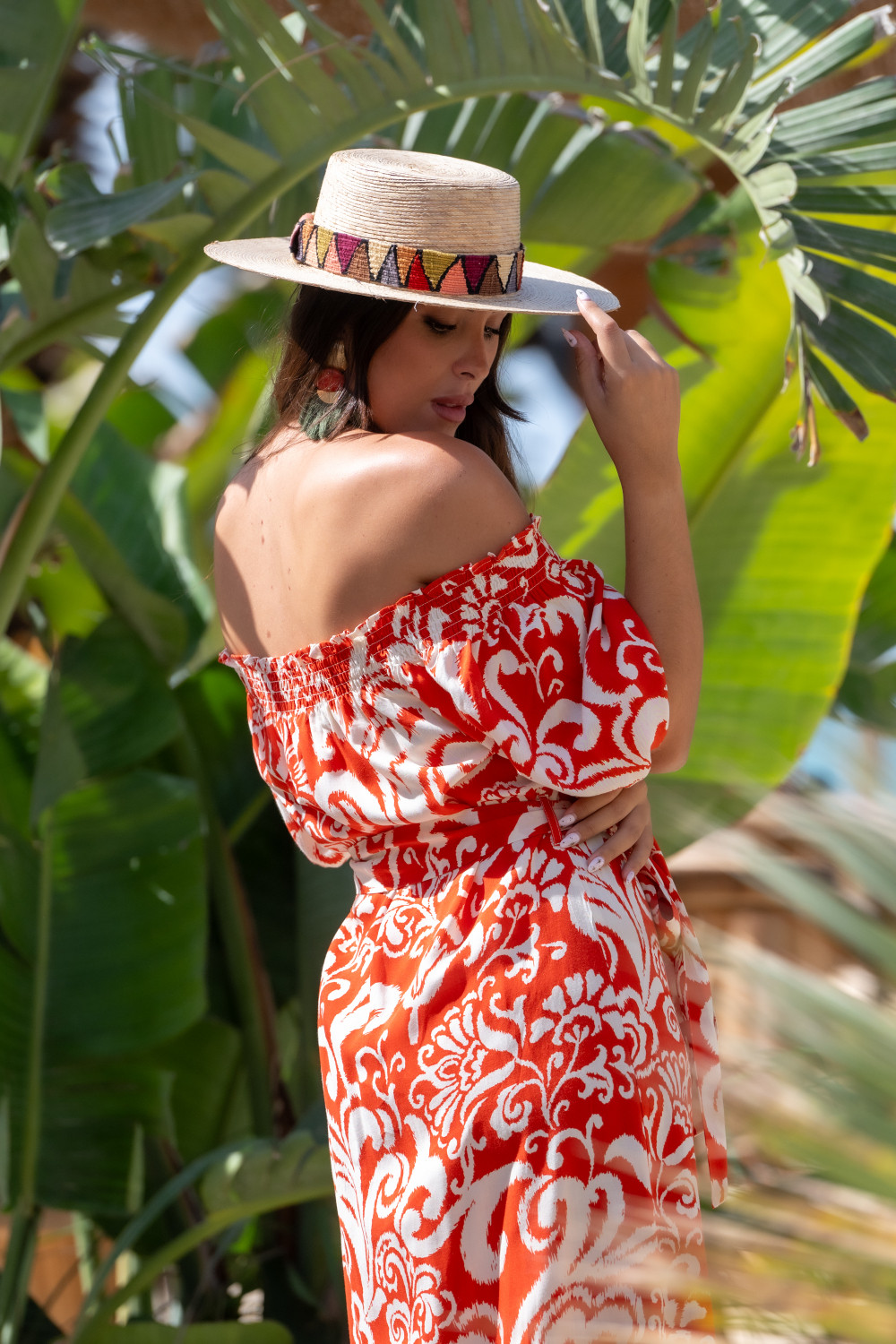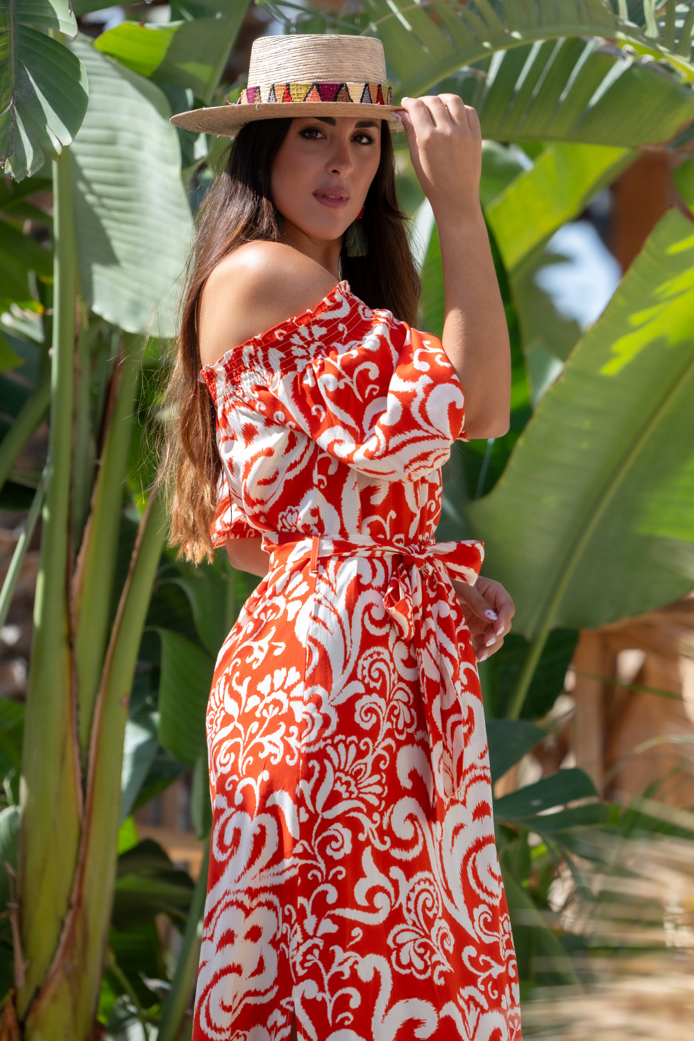Vestido maxi cruzado y anudado en cintuta con volante en el bajo que sube hacia el cruce y manga campana acabada en volante de capa. Tejido en polisilk y estampado organico en tonos coral y morado Sunset &...