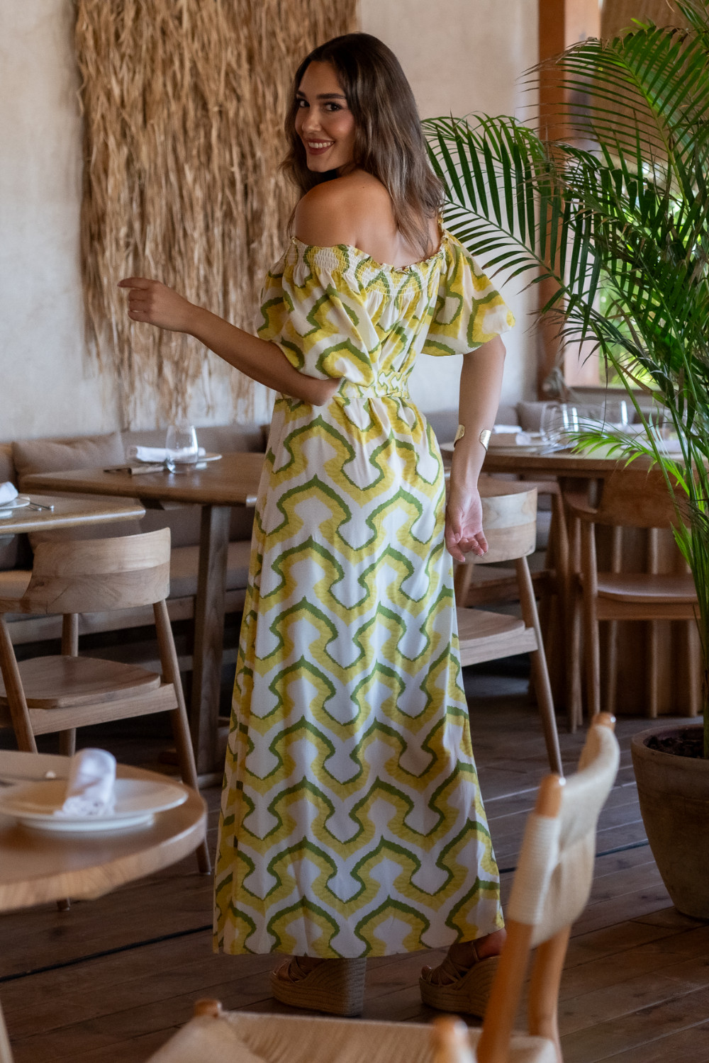 Vestido suelto con escote y hombros con banda elastica, manga abullonada y cinturon independiente. Tejido en viscosa y estampado art deco en tonos caldera y blanco Sunset & Moon.Calidad: 100% Viscosa