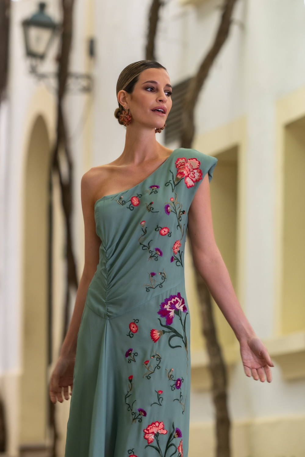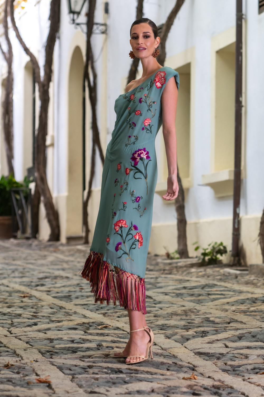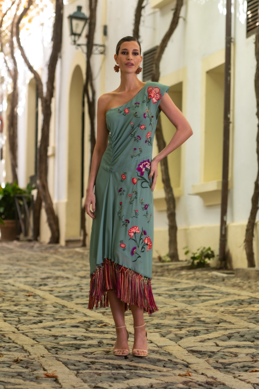 Vestido verde en gasa bordado de claveles tonos morados y coral , con recogido a un lado y flecos con enrejado al filo. escote asimétrico con hombrera.