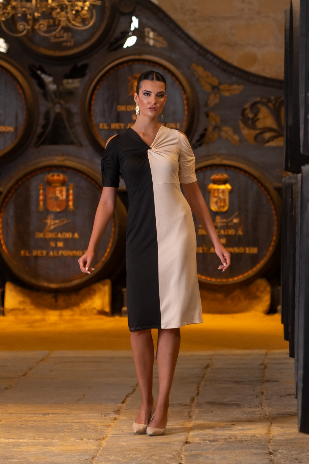 Vestido dry bicolor blanco y negro en punto de seda con manga corta y nudo en la manga y el escote. Calidad: 95% Poliester 5% Spandex