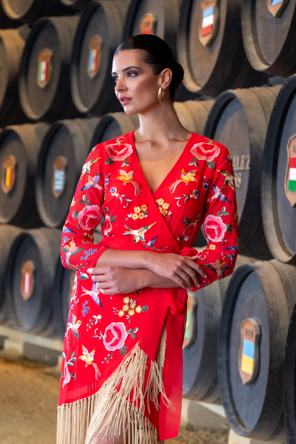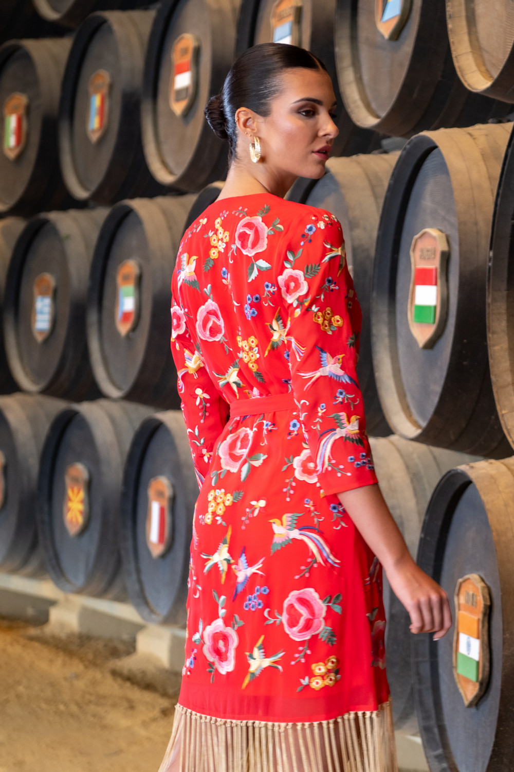 Vestido tarantos buganvilla de gasa bordada en beige con flores de mantón y motivo central de un pavo real, de tiranta ancha y corto con flecos largos beige en el bajo.CALIDAD: GASA - 100% POLYESTER