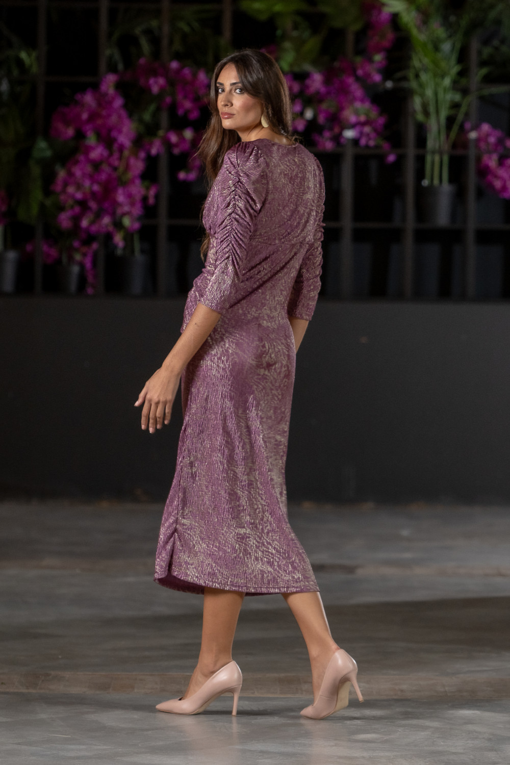 Vestido moscatel lila de punto con trazos oro de media manga, escote de pico fruncido hasta la cintura.
