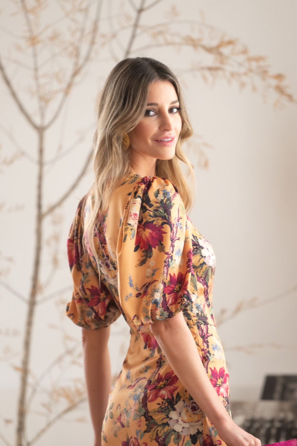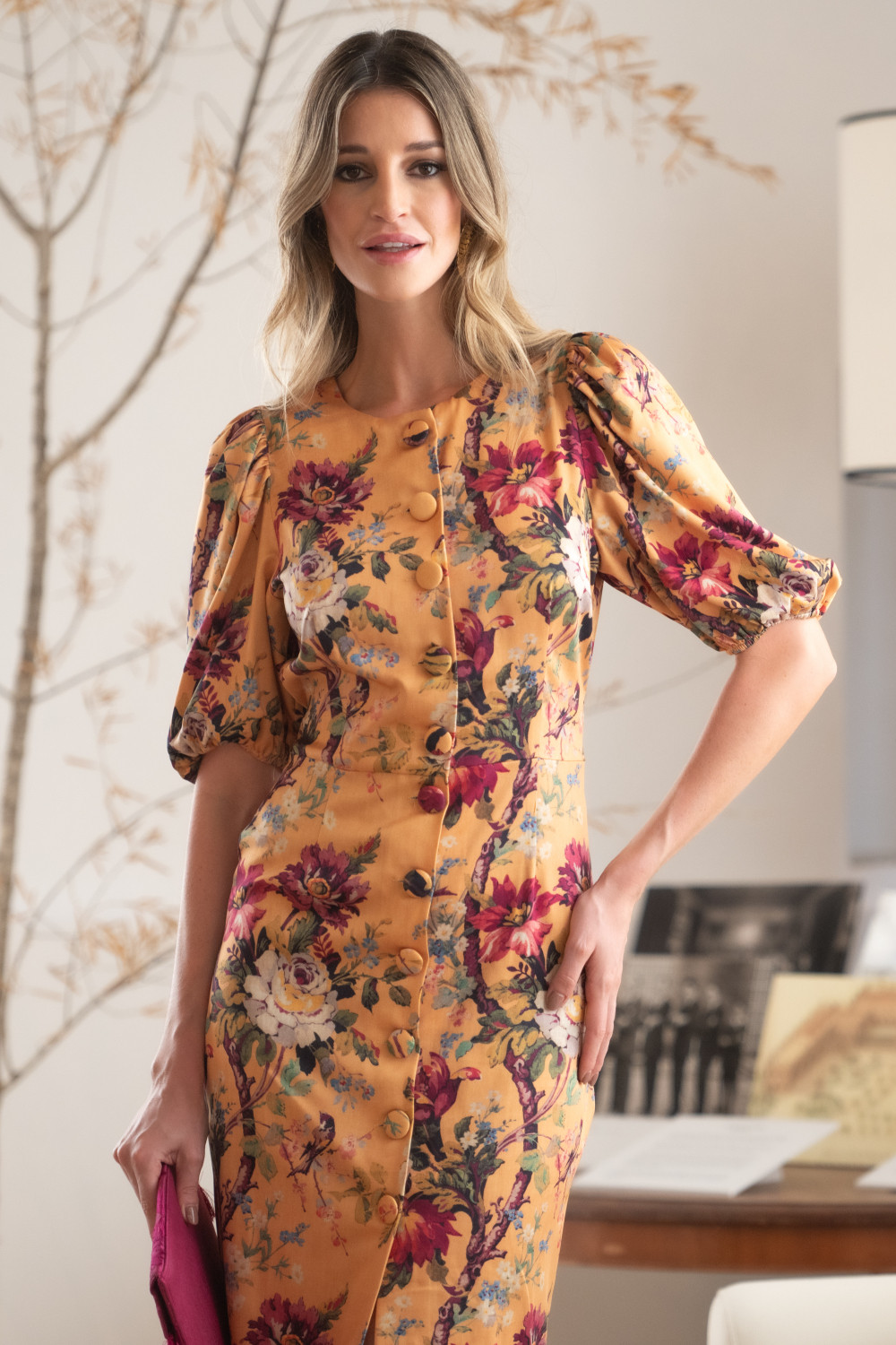 Vestido albero mostaza camisero de satén estampado de fondo mostaza con ramos de flores en tonos rosas, beige y hojas verdes con manga globo corta y escote a la caja.