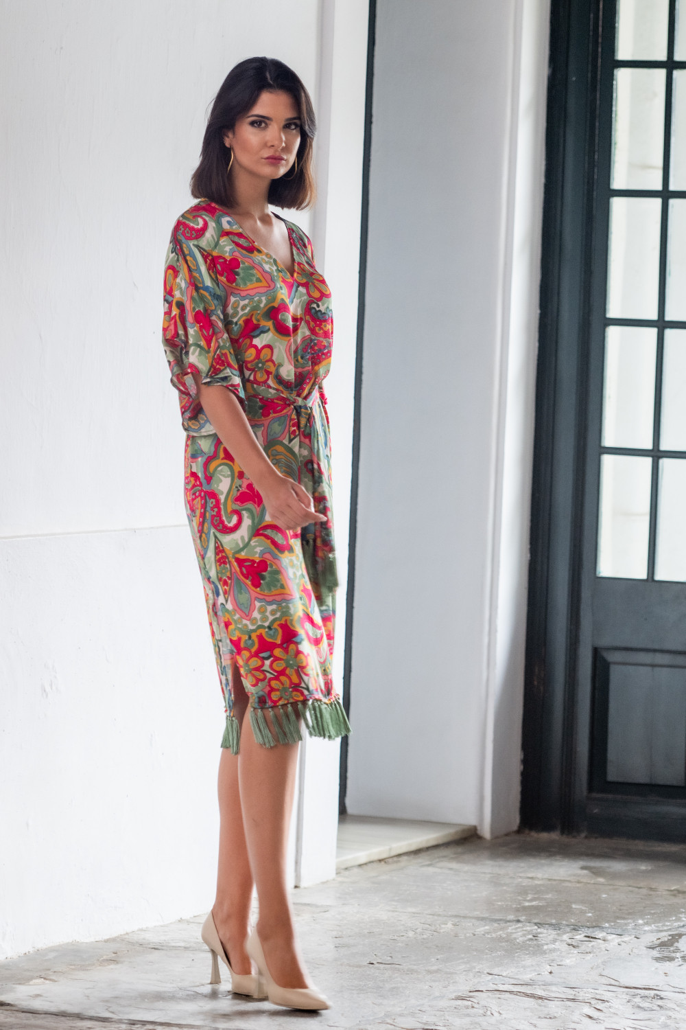 Vestido salseo tapiz en gasa estampada de cachemira en tonos fucsia y coral y verde con manga japo terminada en volante y rematado en el bajo y en el fajín con flecos verdes. Calidad: 97% Algodón 3% Elastano - Flecos:100% Poliéster