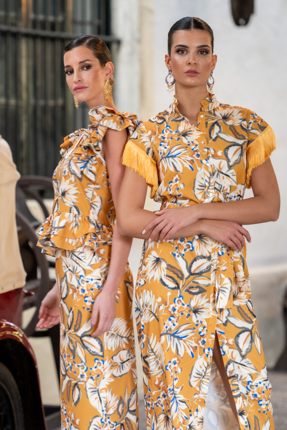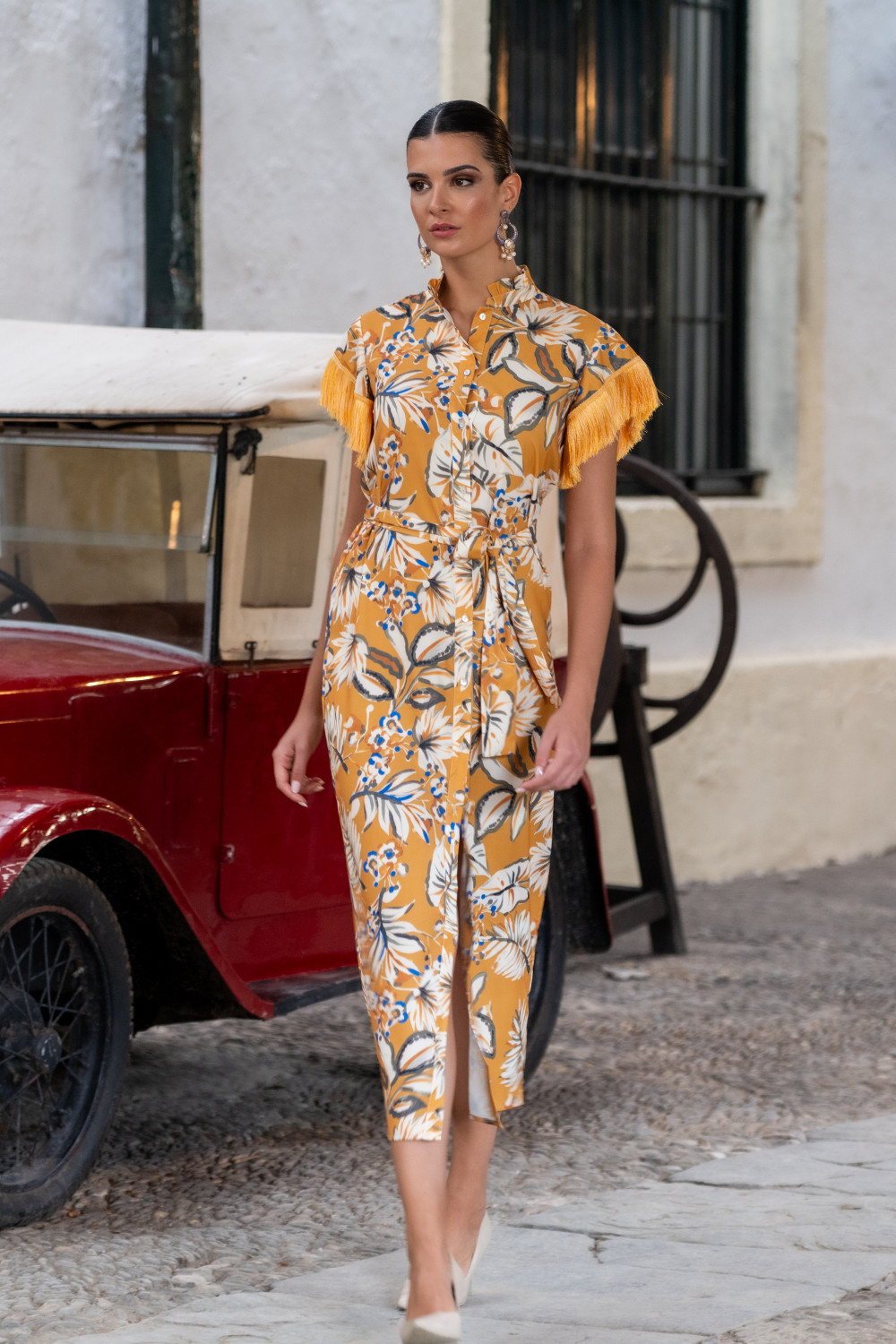 Vestido jara yellow camisero estampado de satén amarillo con flores y hojas crudo de manga corta rematadas con flecos de hijo amarillo. Calidad: 100% Poliéster - Flecos: 100% Poliéster