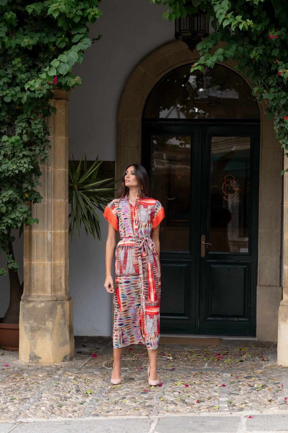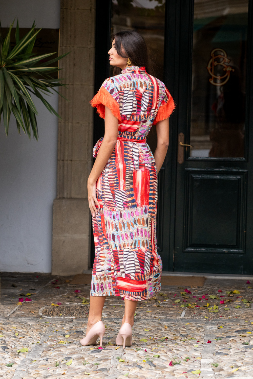 Vestido jara orange camisero de satén en tonos naranjas, ocres de manga cortarematadas con flecos de hijo amarillo.