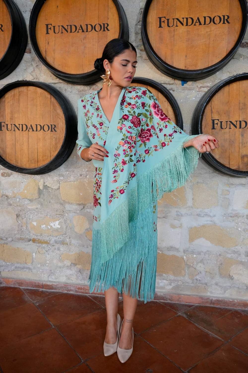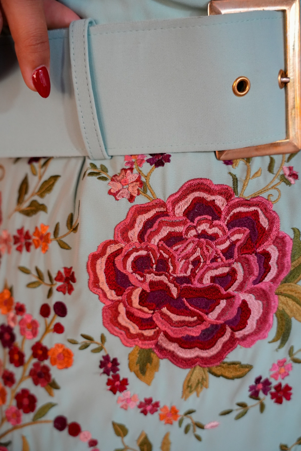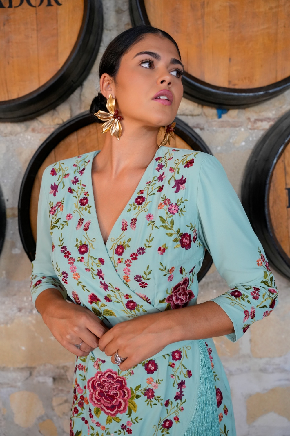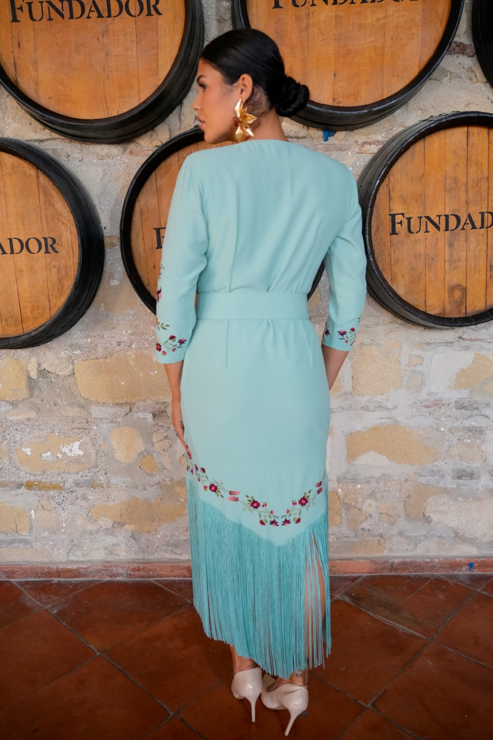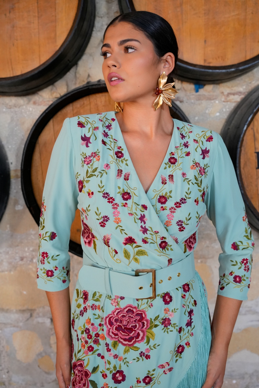 Vestido Suspiro aqua cruzado con flecos bordado sutil con clores en tonos rosas, rojos y coral y cinturon con hebilla Káhyra.