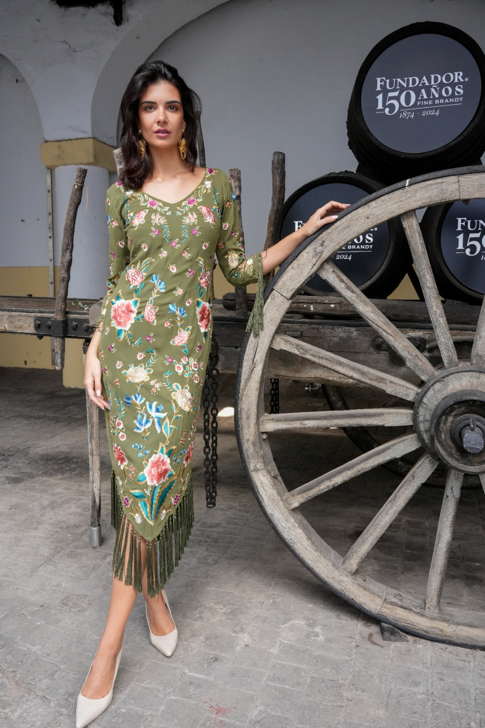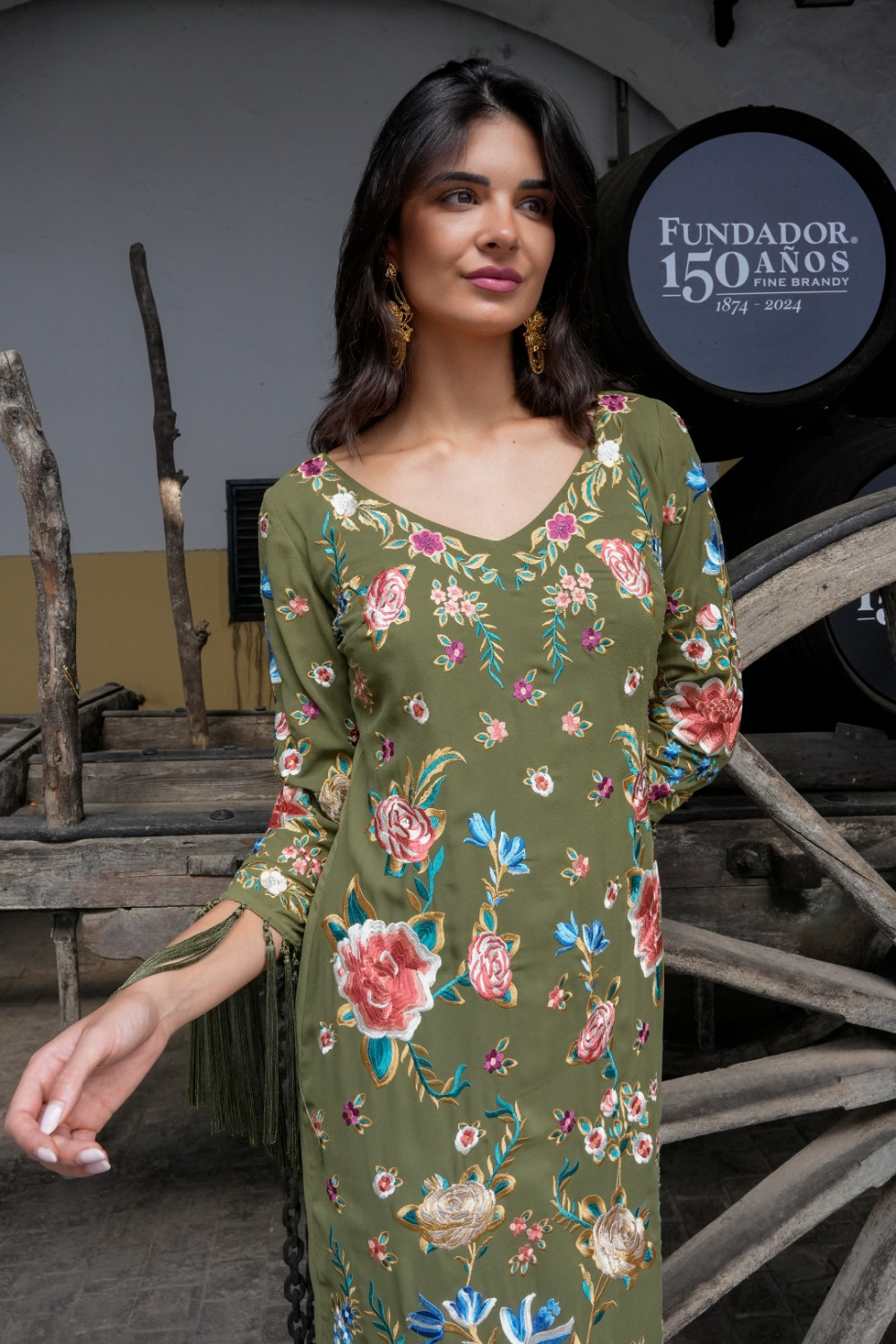 Vestido Valle verde de gasa con manga francesa y escote en v. bordado y con flecos al tono en el bajo de manga y vestido en forma de mantón Káhyra. COMPOSICIÓN: 100% POLIÉSTER FORRO: 100% POLIÉSTER ACCESORIOS: FLECOS 100% VISCOSA