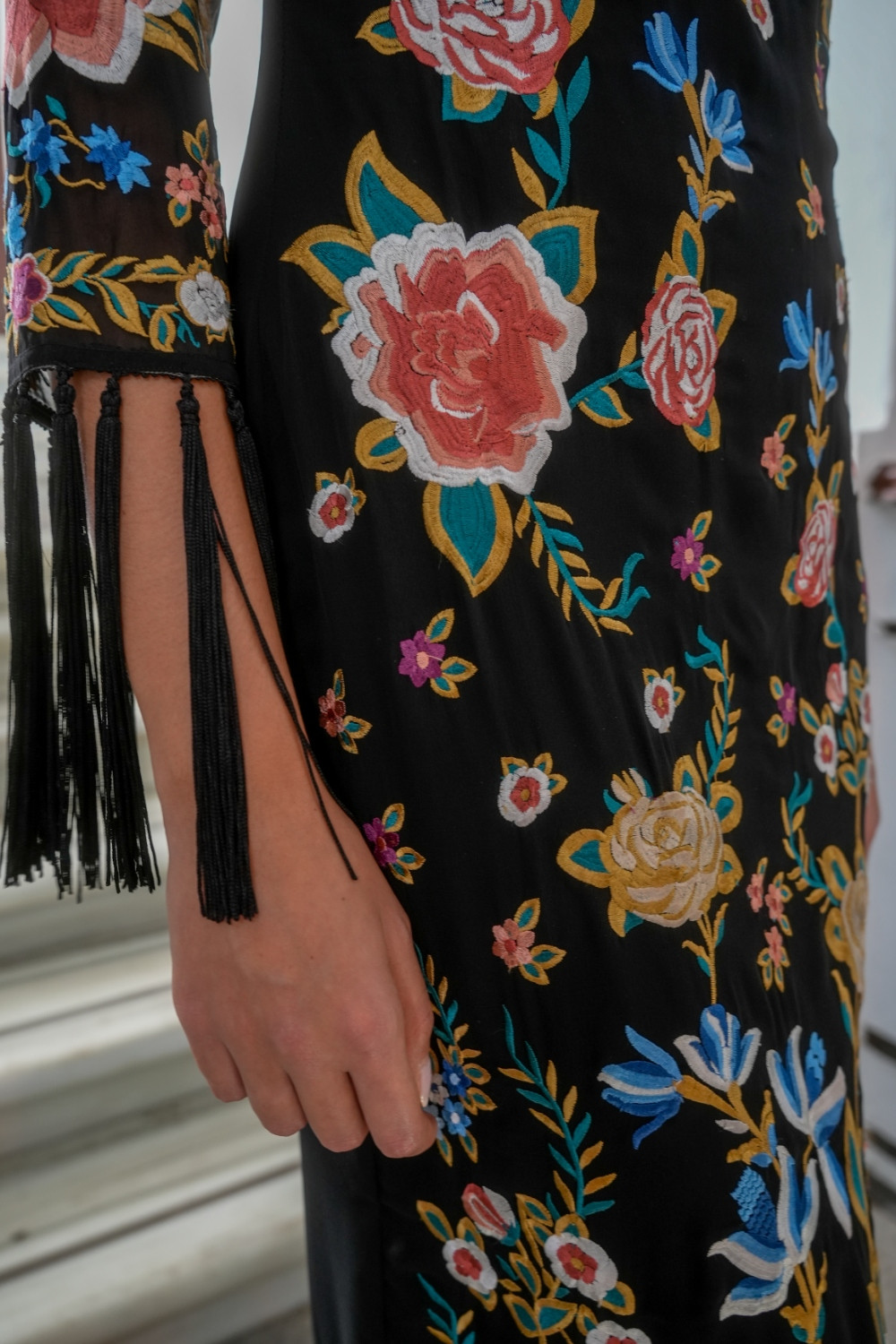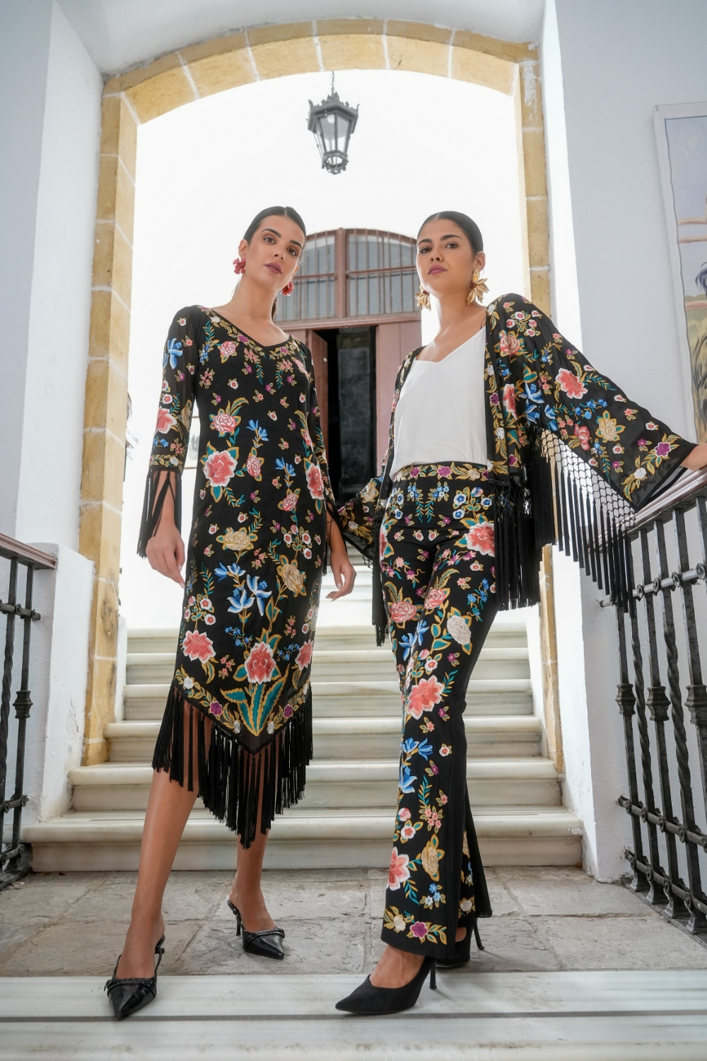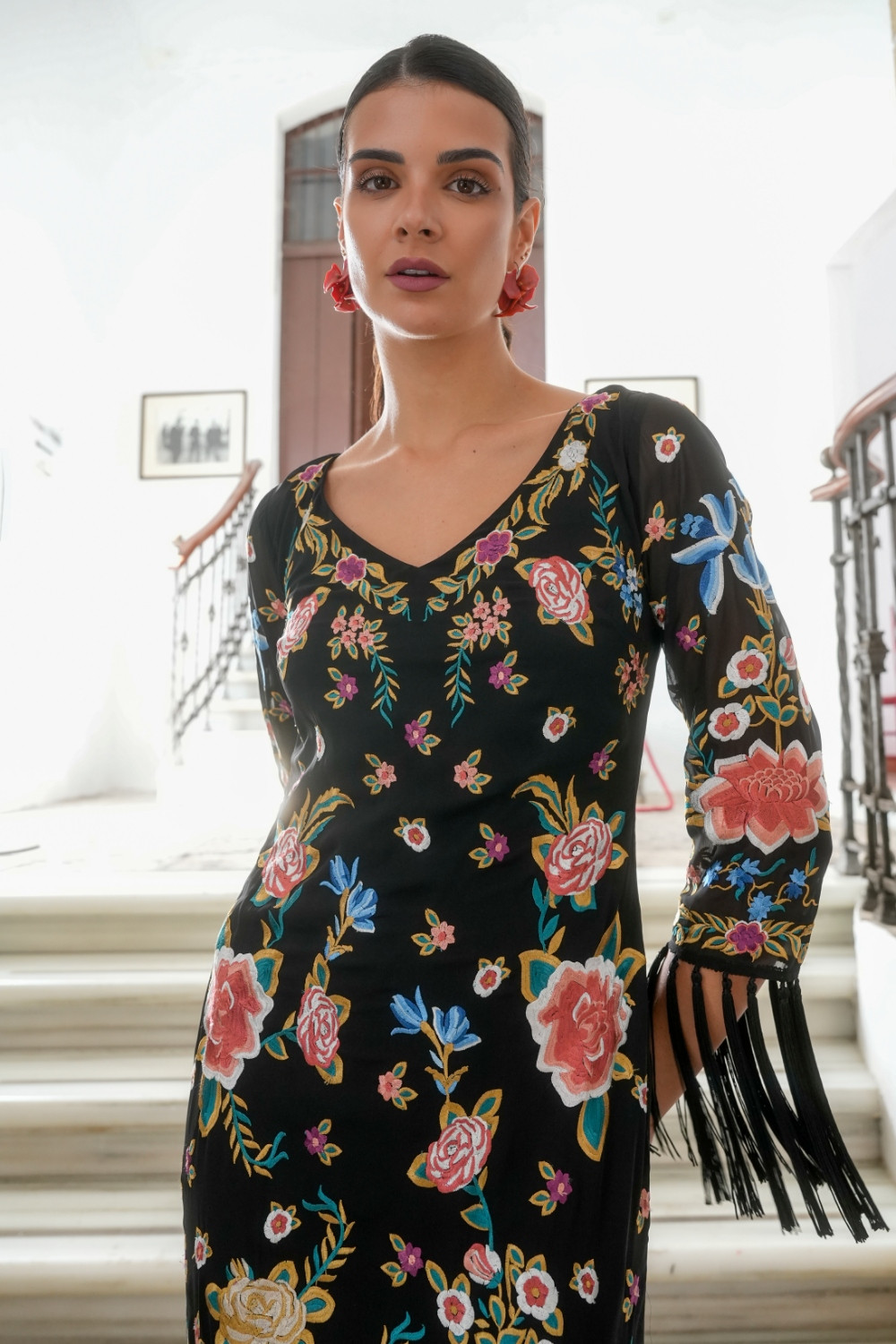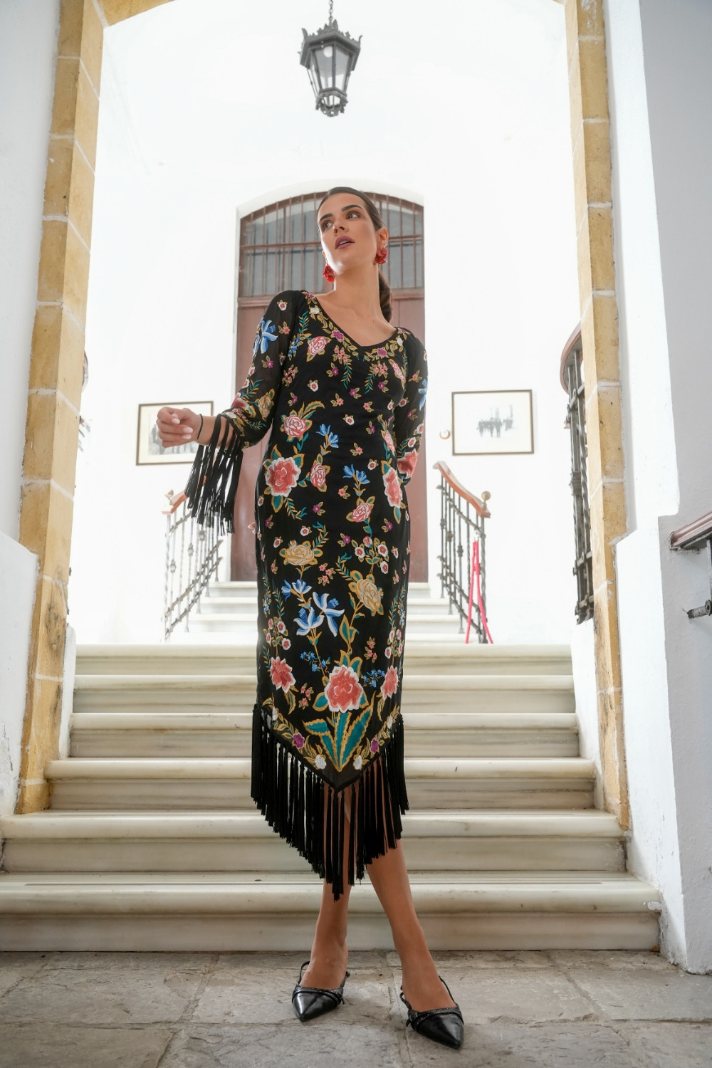 Vestido Valle negro de gasa con manga francesa y escote en v, bordado y con flecos al tono en el bajo de manga y vestido en forma de mantón Káhyra.