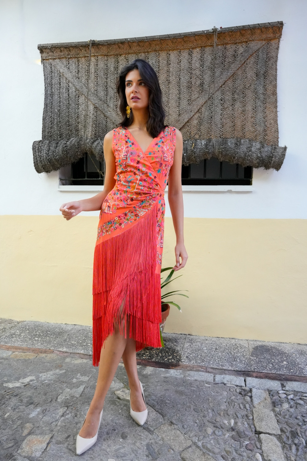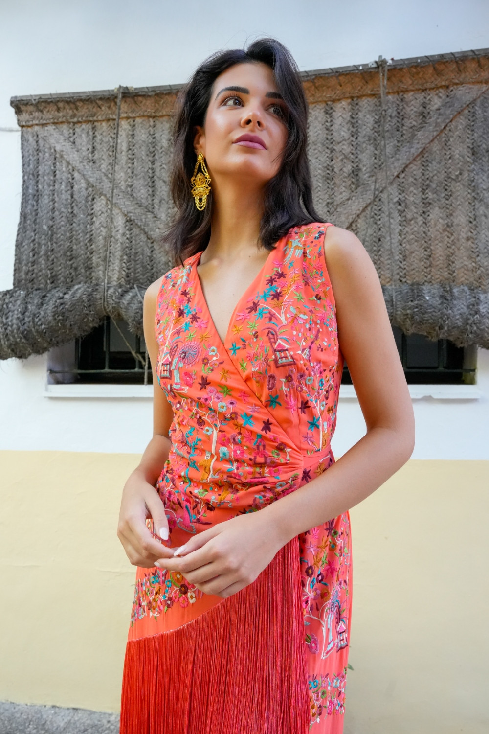 Vestido Loto coral de gasa cruzado sin manga con flecos al tono y bordado mantón antiguo con motivos chinos Káhyra.