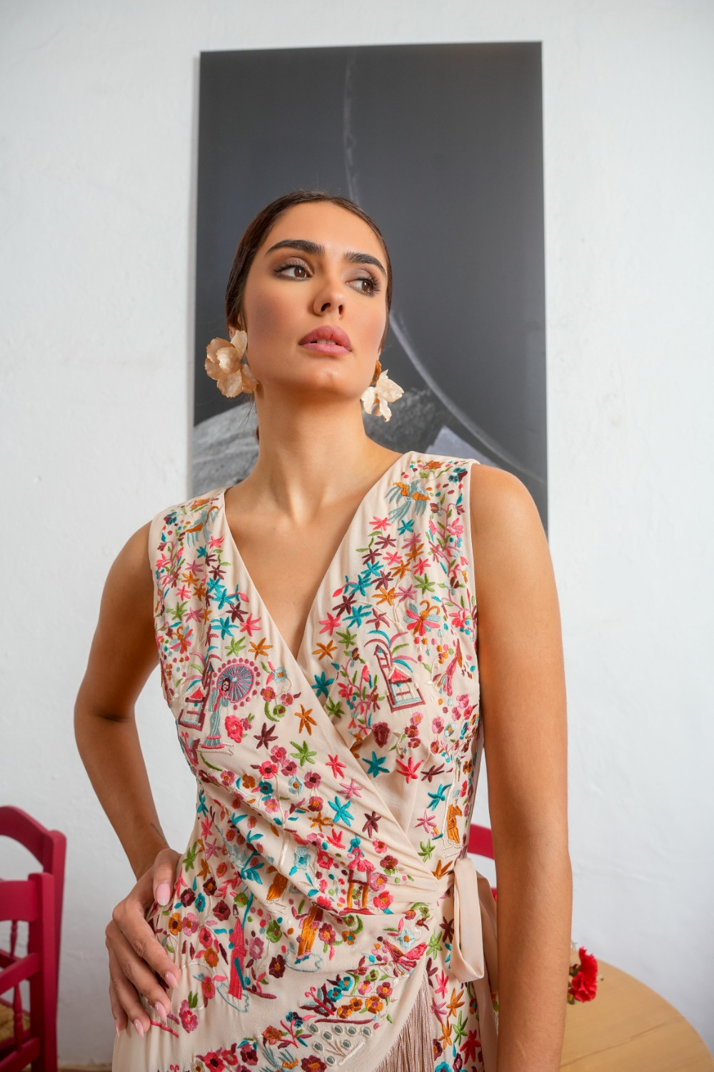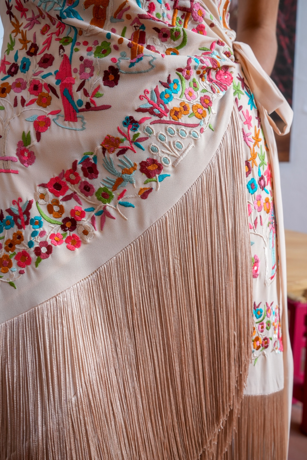 Vestido Loto marfil de gasa cruzado sin manga con flecos al tono y bordado mantón antiguo con motivos chinos Káhyra.