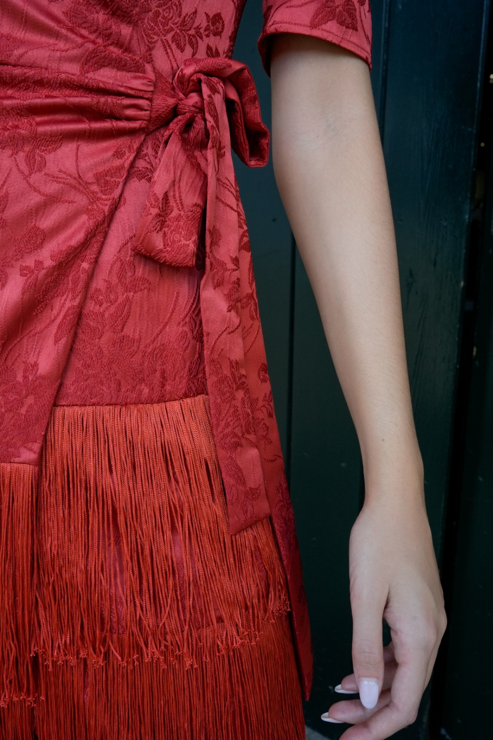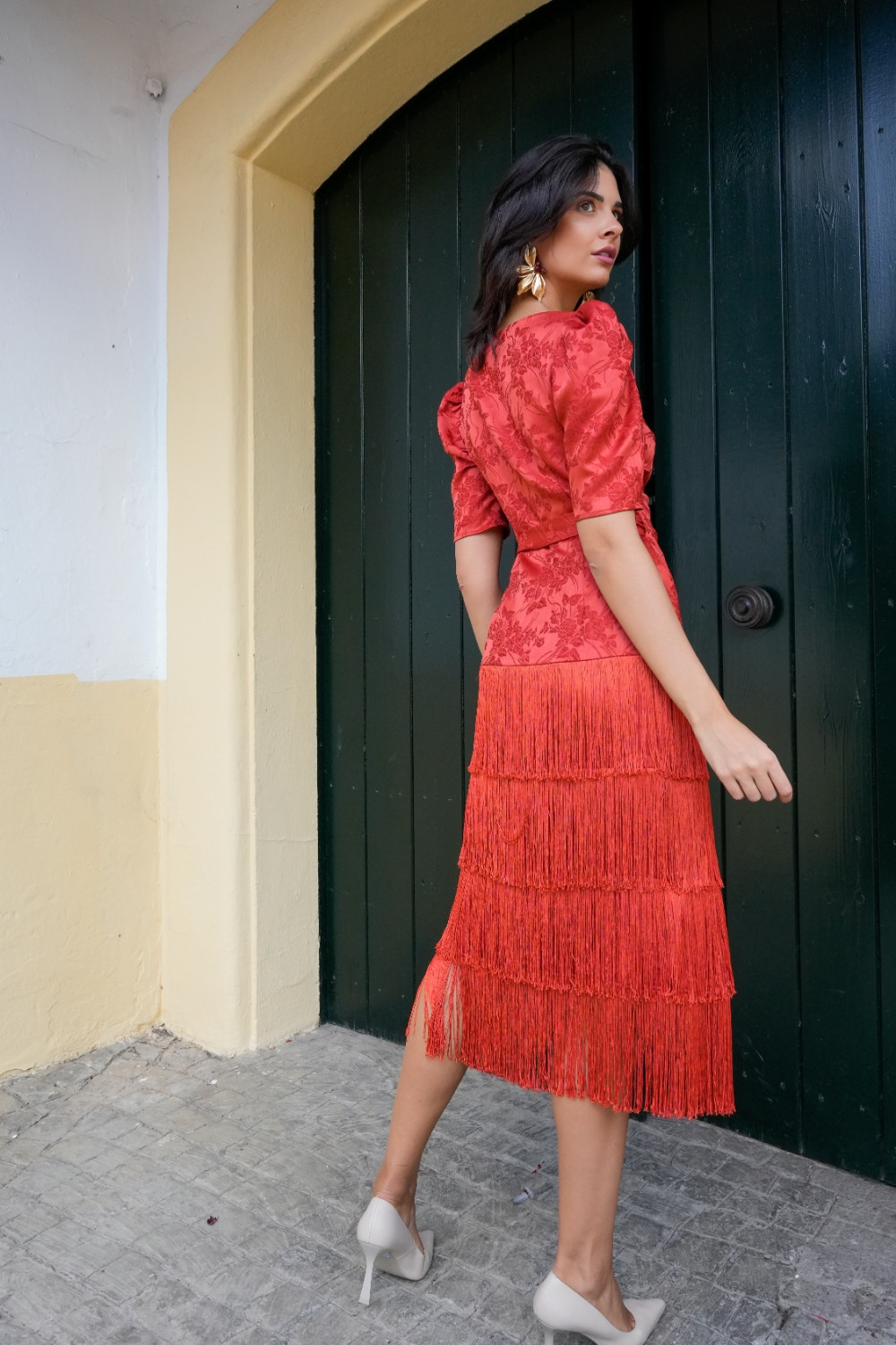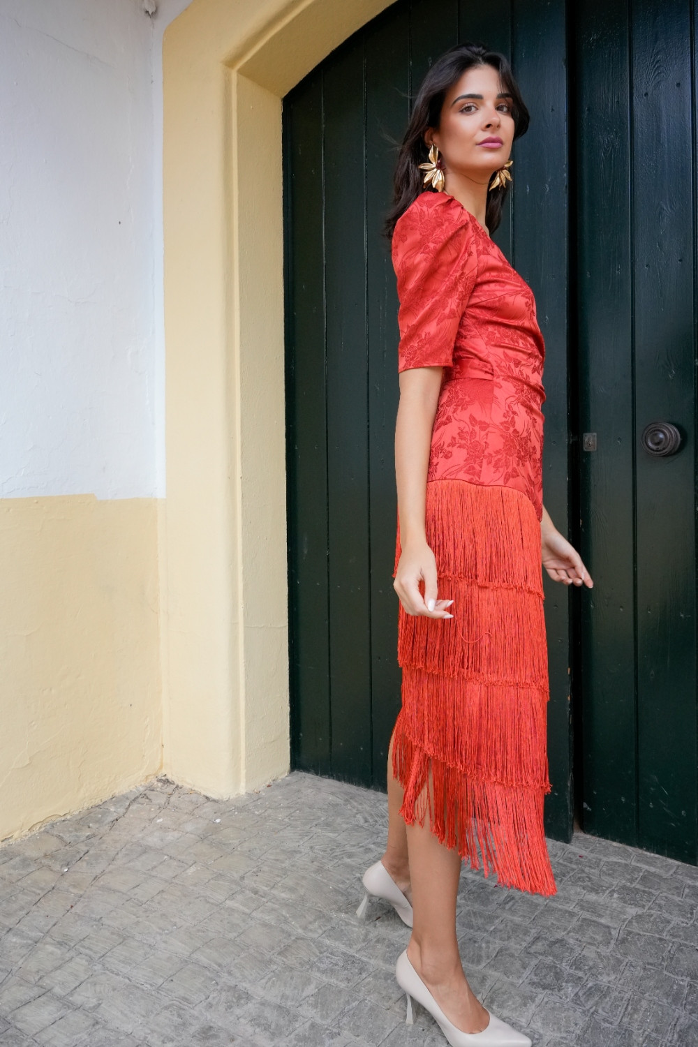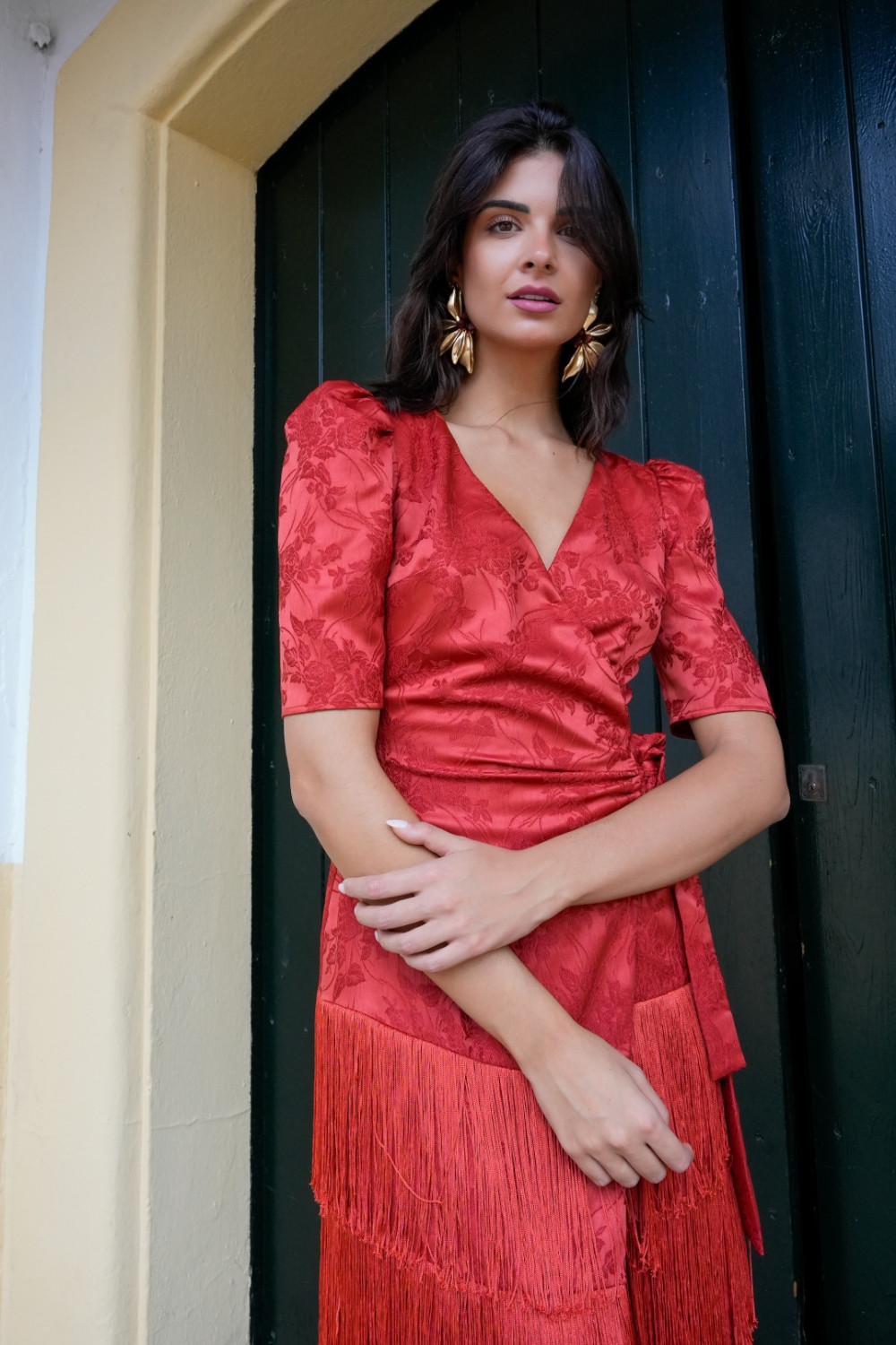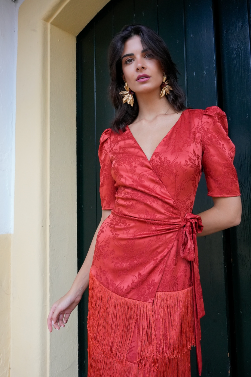 Vestido Encanto rojo brocado cruzado con flecos y manga al codo globo Káhyra. COMPOSICIÓN: 100%POLIÉSTER FORRO: 100%POLIÉSTER ACCESORIOS: 100%POLIÉSTER