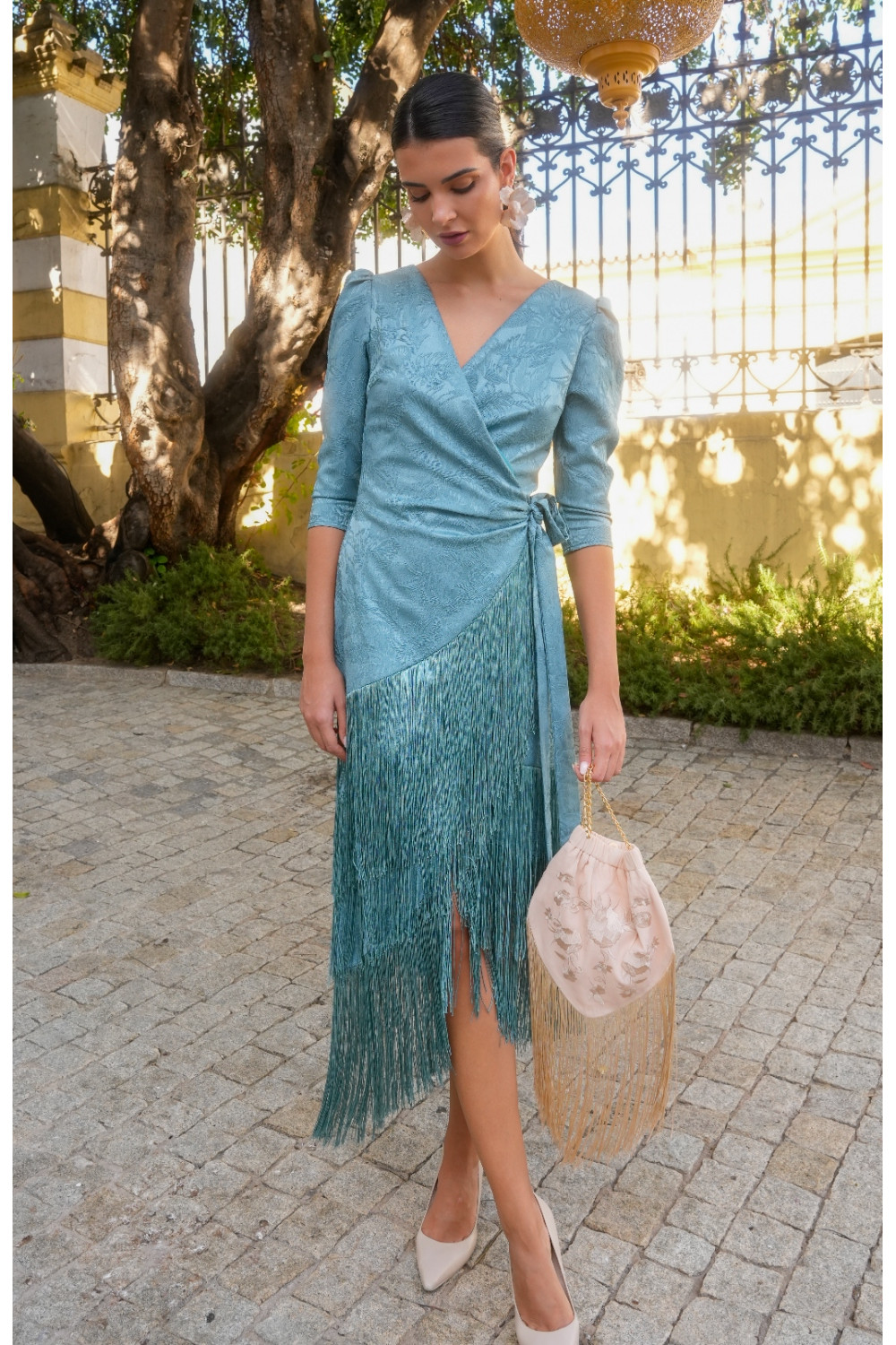 Vestido Luz verde cruzado de satén brocado cruzado media manga con flecos largos y amarrado a la cintura Kahyra. COMPOSICIÓN: 95%POLIÉSTER.5%LICRA FORRO: 100%POLIÉSTER ACCESORIOS: FLECOS-100%POLIÉSTER